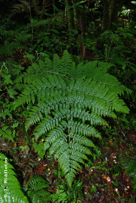 Acrophorus nodosus C.PreslFamilyDryopteridaceae NomenclatureAcrophorus nodosus C.Presl, Tent. Pterid.: 94, t. 3, f 2. 1836. – Leucostegia nodosa (C.Presl) Bedd., Suppl. Ferns Brit. Ind.: 4. 1876; Bedd., Handb. Ferns Brit. India: 54, f. 26 1883, p.p. – Peranema nodosa (C.Presl) Fraser-Jenk., Taxon. Revis. Indian Subcontinental Pteridophytes : 317. 2008. Acrophorus stipellatus T.Moore, Gard. Chron. 1854: 135. 1854, nom. nud.; Tardieu & C.Chr., Fl. Indo-Chine 7(2): 296, f. 31.3 & 31.4. 1941; Tagawa & K.Iwats., SouthE. Asian Stud. 5: 92. 1967; Tagawa & K.Iwats., Fl. Thailand 3: 328, f. 28.1 & 28.2. 1988; Boonkerd & Pollawatn, Pterid. Thailand: 155, 156, 198. 2000. DescriptionTerrestrial. Rhizome thick, bearing a few fronds; scales oblong-oval, acute to acuminate at apex, cordate at base, up to 1 cm or more long, 8 mm broad, membranous, brown, concolorous. Stipes stramineous, rather densely scaly at base, about 80 cm long. Laminae oblong-subdeltoid, acute at apex, up to 100 by 80 cm, 4 to 5 times pinnately divided; lateral pinnae several pairs, opposite, the lowest the largest, asymmetrically oblong-subtriangular, up to 50 by 35 cm, basal anterior pinnules larger; pinna-rachis at right angles to rachis, i.e. almost straight with the opposite ones, slightly bending upwards in distal portion, grooved on upper surface, grooves separated from those of the joining axes by scaly edges; larger pinnule like upper pinna, oblong, rounded to moderately acute at apex, broadly cuneate to subtruncate at subsessile or shortly stalked base, 3–4 by 1.5 cm; ultimate segments oblong, unequally cuneate at sessile base, lobed almost to axes, up to 9 by 4 mm; lobes oblong or spathulate, entire; herbaceous, light green, veins all free, hairy on upper side with coarse multicellular hairs. Sori round, subterminal at veinlets; indusia cup-shaped, attached on basal side, at first covering the sori entirely, later only under sori, persistent . Distribution in ThailandNORTHERN: Mae Hong Son, Chiang Mai. Wider DistributionHimalayas to S China and Taiwan, north to southern edge of Japan (Isl. Yakushima). EcologyOn humus-rich floor of dense evergreen forests only at highest regions higher than 1800 m alt. Proposed IUCN Conservation AssessmentLeast Concern (LC). This species is widespread and not under any known threat. Voucher specimens - ThailandMiddleton et al. 4906, Chiang Mai, Doi Inthanon National Park (E). Habit Rhizome Frond architechture Pinnules with older sori Pinnules with younger sori |