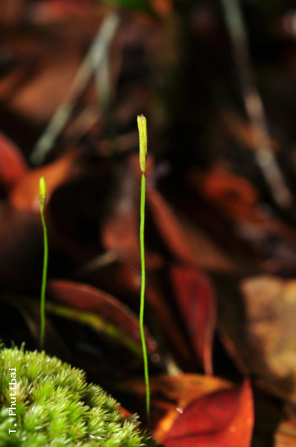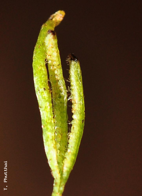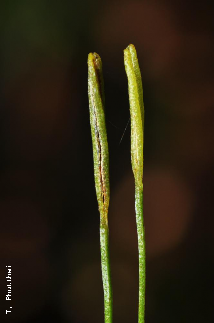 Actinostachys wagneri (Selling) C.F.ReedFamilySchizaeaceae NomenclatureActinostachys wagneri (Selling) C.F.Reed, Bol. Soc. Brot. 21: 131. 1947; Jaman & Umi Kalsom, Fl. Pen. Malaysia, Ser. I, Ferns & Lycoph. 1: 111, map 1. 2010. – Schizaea wagneri Selling, Svensk Bot. Tidskr. 40: 278, f. 8-11. 1946; Holttum, Rev. Fl. Malaya ed. 1, 2: 52. 1955 ['1954']; Holttum, Fl. Males., Ser. II, Pterid. 1: 44, f. 4e-g. 1959; Holttum, Rev. Fl. Malaya ed. 2, 2: 52. 1968; Lindsay et al., Thai For. Bull. (Bot.) 40: 14. 2012. – Type: Papua New Guinea, Admiralty Islands, Manus Island, Summit of Mt Tjajiak, Grether & Wagner 4177, November 1945 (holotype : UC [barcode UC701236]; isotypes; K [barcode: K000408661], S). Schizaea paucijuga Holttum, Gard. Bull. Singapore 11: 267. 1947. – Type: Malaysia, Kedah Peak, Haniff SFN 1098 (holotype : SING). DescriptionTerrestrial or sometimes appearing to be epiphytic at base of trees; rhizome short-creeping, producing fronds close together, less than 1 mm diameter, with a few thick, stiff, wiry roots c. 0.2 mm diameter; root hairs to 3 mm long; apex of rhizome densely covered in coarse brown multiseptate hairs up to 1.5 mm long. Fronds monomorphic, erect, simple, linear, (3–)7.5–16.5(–20) cm long, less than 0.7 mm wide, reddish brown and terete or triquete at base, gradually becoming green and very narrowly winged above the base (therefore, no distinct stipe); basal portion sometimes sinuous and/or horizontal (especially if growing through leaf litter or moss); midrib rather broad and slightly to prominently raised on lower surface of winged portion but indistinct above, other venation, if any, obscure; with 2-celled dark glandular hairs sparse throughout; stomata on the lower surface only, widely spaced, in 1 row on each side of the midrib and close to it. Sporangia produced only at the frond apex in a digitate cluster of (2–)3–4(–5) fertile lobes; fertile lobes linear, slightly twisted together when young but untwisting as they mature and separate, (3.5–)7–15(–19) mm long, less than 0.7 mm wide, with entire margins, venation of each lobe a single broad medial vein slightly raised below but indistinct above, with 2-celled dark glandular hairs above. Sporangia ovoid, sessile, each with a large apical annulus, usually arranged in 2 rows (very rarely with short sections of 3 rows) the entire length of the lobes; long filiform transparent reddish-brown paraphyses protruding between sporangia, 2–4 times longer than sporangia, flat, twisted, ribbon-like with rounded ends and all originating from the vein. Spores monolete, bilateral , finely verrucose. Distribution in ThailandPENINSULAR: Phangnga. Wider DistributionPeninsular Malaysia, Singapore, Borneo, Moluccas, New Guinea, NE Australia. EcologyIn Thailand, Actinostachys wagneri is only known from beach forest at sea level but elsewhere it has been reported from a range of forest types and altitudes (eg. to 440 m in Peninsular Malaysia and to 1600 m in New Guinea). Plants are usually terrestrial in leaf litter or humus, in moss or on rotten logs but they can sometimes appear to be epiphytic in moss at the base of trees. Actinostachys wagneri is reported to grow with Actinostachys digitata in New Guinea and with both Actinostachys digitata and Schizaea dichotoma in Peninsular Malaysia and Singapore. Similar speciesActinostachys digitata (L.) Wall. ex C.F.Reed. Proposed IUCN Conservation AssessmentLeast Concern (LC). Although this species has been collected only once in Thailand and is known from relatively few localities in Peninsular Malaysia (Kedah, Perak and Johor) it is very widespread and not under any known threat. Voucher specimens - ThailandPhutthai, Sridith & Chanthanaotrapint 247, Phangnga, Tai Muang, Khao Lampi-Hat Tai Muang National Park (PSU). Habit Rhizome Fertile section