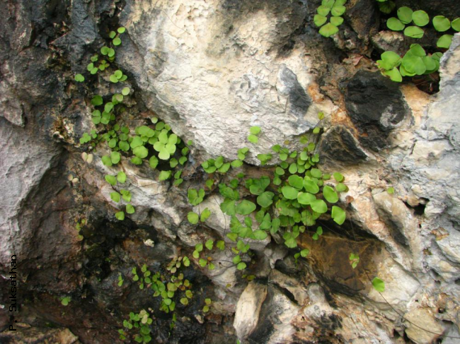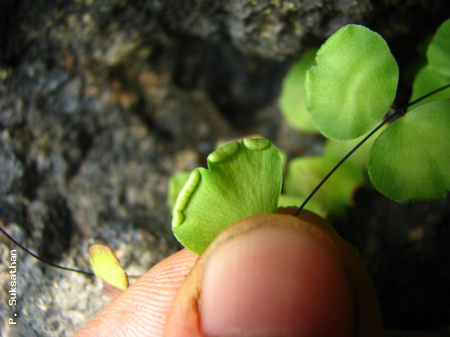 Adiantum capillus-junonis Rupr.FamilyPteridaceae, subfamily Vittarioideae NomenclatureAdiantum capillus-junonis Rupr., Dist. Crypt. Vasc. Ross. 49. 1845; Boonkerd & Pollwatn, ScienceAsia 37: 370–372. 2011. DescriptionDescription from Boonkerd & Pollwatn, ScienceAsia 37: 370–372. 2011. Rhizomes short erect; covered with brown lanceolate scales, the scales 4–5.4 mm long, margin glabrous. Stipes 3.4–8.7 cm long, 0.12–0.54 mm in diam., deep-castaneous and polished, scales like those on rhizome, smooth upwards. Laminae simply pinnate, oblong-lanceolate, 3.5–13 by 3.5–5.5 cm; pinnae stipitate, 1–3 pairs, lateral pinnae opposite or subopposite; stalks 0.1–0.5 cm, articulated to pinnae at base of pinnae, persistent; lower pairs of pinnae 1.2–2.1 by 1.5–2.5 cm; pinnae circular to obtriangular, base broad cuneate to rounded, basal edges entire, upper margins rounded; fertile pinnae with 2–5 shallow sinuses, slightly denticulate to entire on sterile parts; sterile pinnae slightly denticulate to entire on upper margins; upper pinnae and terminal pinnae similar; softly herbaceous or membranous, glabrous on both surfaces; veins dichotomous, prominent on both sides. Sori 2–5, at margin of pinnae, reflexed soral flaps oblong to reniform, about 1.2 mm broad, up to 3 mm long. Sporangia on short stalk, 1/3 as long as the capsule; capsule ca. 350 micrometres by 275 micrometres, with 28–30 indurated annulus cells. Spores trilete , mostly 56–62 micrometres diam. Distribution in ThailandNORTH-EASTERN: Phetchabun, Loei. Wider DistributionJapan, China, Taiwan, Thailand. EcologyOn wet limestone rock walls in semishade, 600–900 m. Similar speciesAdiantum erylliae C.Chr. & Tardieu Proposed IUCN Conservation AssessmentLeast Concern (LC). This species is widespread and not under any known threats. Habit Habit Sori |