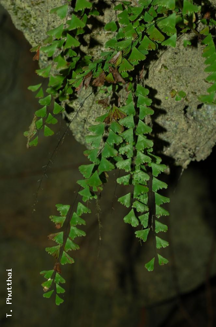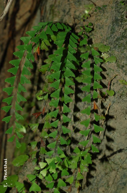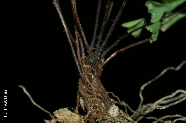 Adiantum gomphophyllum BakerEtymologyAccording to Holttum (1954), the botanical name, Adiantum (unwetted) refers to the way in which water-drops run off the surface of the pinnae without wetting them. FamilyPteridaceae, subfamily Vittarioideae NomenclatureAdiantum gomphophyllum Baker, Ann. Bot. (Oxford) 8: 124. 1894. – Type: Thailand, Phangnga, Curtis 2958 (K; possibly unnumbered isotype E). DescriptionLithophytic. Rhizome short, erect, covered with scales; scales narrow, black with a pale brown margin, 1.5–2.5 mm long, 0.1–0.2 mm wide, margin entire. Stipe dark brown, 1–5 cm long, glabrous or with a few scales near base. Laminae simply pinnate, 6–30 cm long, 1.4–3.1 cm wide, oblong in outline; rachis glabrous; pinnae 6–22 on each side of rachis, gradually becoming slightly smaller upwards; pinnae on stalks 2–3 mm long; pinnae flabellate, sometimes with the lower margin slightly longer, 9–14 by 6–14 mm, base cuneate, margins entire and straight or with lower margin weakly sinuate, flat apex with a narrow and shallow sinus in some pinnae, thin, glabrous above and beneath; veins dichotomous, slightly raised above; stipe, rachis and pinnae stalks persistent. Sori on flat apex of lobes, 2–5, elongate , 1–1.5 mm long. Distribution in ThailandPENINSULAR: Phangnga, Satun. Wider DistributionEndemic to Thailand. EcologyIn crevices of limestone cliffs in forest at low altitude. Similar speciesAdiantum phanomensis S.Linds. & D.J.Middleton Proposed IUCN Conservation AssessmentVulnerable B1ab(ii)(iii). This species is confined to karst limestone, a habitat that is often exploited for cement production or degraded due to fire in surrounded farmland or recreational use. Although the exact Extent of Occurrence is unknown it is clearly is less than 20,000 km2, justifying a vulnerable category. Voucher specimens - ThailandMiddleton et al. 5363, Satun, Phu Pha Phet Cave area (E); Middleton et al. 5426, Phangnga, Tham Pha Phueng (E). Habit Habit Rhizome Whole plant Upper surface of lamina Lower surface of pinnae Young sori Young sori Old sori |