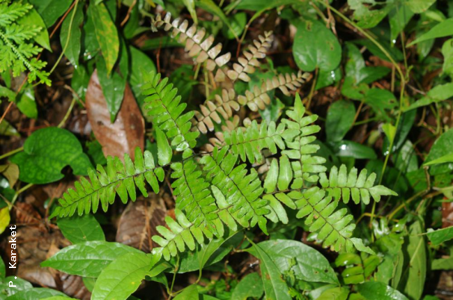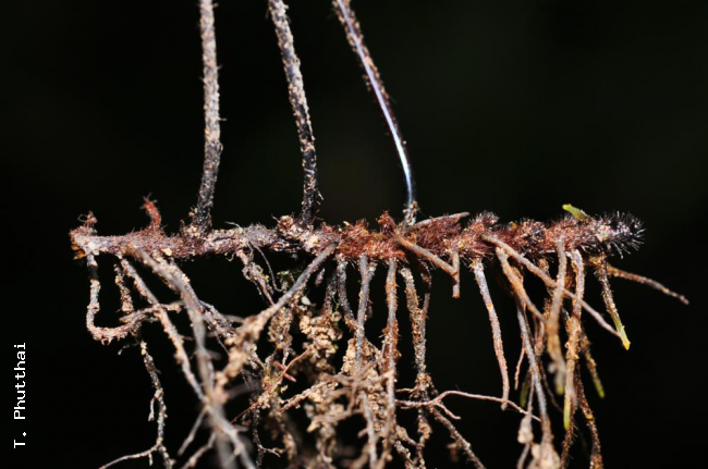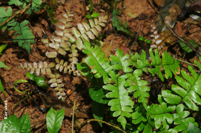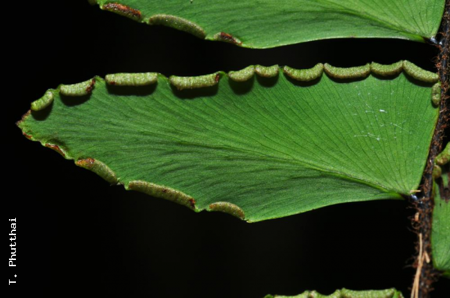 Adiantum latifolium Lam.EtymologyAccording to Holttum (1954), the botanical name, Adiantum (unwetted) refers to the way in which water-drops run off the surface of the pinnae without wetting them. FamilyPteridaceae, subfamily Vittarioideae NomenclatureAdiantum latifolium Lam., Encycl. 1: 43. 1783; Proctor in Howard (ed.), Fl. Lesser Antilles 2: 114. 1977; Mickel & Smith, Pteridophytes of Mexico: 31. 2004; Boonkerd et al., Thai For. Bull. (Bot.) 32: 7. 2004. DescriptionTerrestrial. Rhizome long creeping, 2–3 mm diam., fronds widely spaced; scales pale brown, 2–3 x 0.5–0.8 mm, linear-lanceolate, clathrate, margin entire or weakly toothed. Stipes dark brown to black, 26–53 cm long, 2–3 mm wide, glabrous to long brown pubescent or stipe and rachis; lamina bipinnate at base, simple pinnate at apex, 19.5–40 by 18–30 cm, more or less triangular to ovate in outline, 1–2(–4) pinnae on each side which are again pinnate plus a pinnate terminal portion similar to the lateral branches, pinnae 7.5–15 cm long, 3.7–6 cm wide; pinnules dimidiate, oblong to triangular, sometimes slightly falcate, more or less sessile, 1.5–6 by 0.5–1.6 cm, apex obtuse to rounded, base obtuse to cuneate, glabrous above and beneath, margin of sterile pinnules minutely sharply serrate, venation simple, repeatedly forked. Sori several along upper edge and approximately outer half of lower margin of each segment, 2–5 mm long, oblong . Distribution in ThailandPENINSULAR: Phangnga, Krabi, Satun, Songkhla, Yala, Narathiwat. Wider DistributionNeotropical, naturalised in the palaeotropics. EcologyDisturbed open areas. Proposed IUCN Conservation AssessmentLeast Concern (LC). This species is weedy and frequently naturalises outside of its natural range. Voucher specimens - ThailandWatthana & Pumicong 2081, Phangnga, Taphud (CMU); Maxwell 06-558, Krabi, Klong Tawm (CMU); Larsen et al. 45772, Songkhla, Ton Nga Chang National Park (QBG); Suksathan 2416, Yala, Khao Pok Yo (QBG); Niyomdham et al. 944, Narathiwat, Sungai Kolok (P). Habit Habit Young frond Rhizome Pinnae with sori |