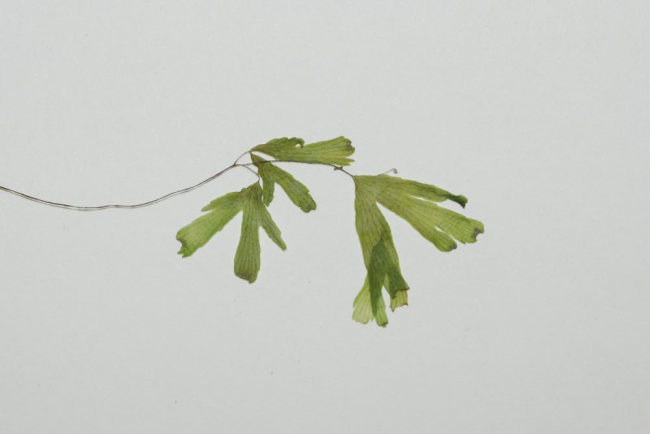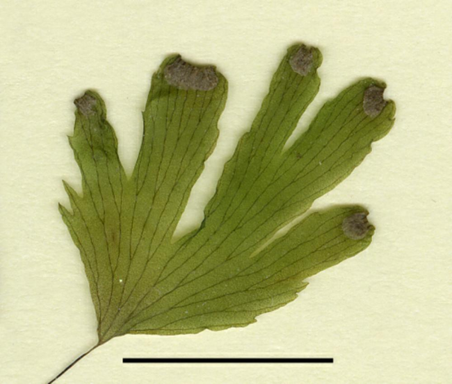 Adiantum membranifolium S.Linds. & SuksathanEtymologyAccording to Holttum (1954), the botanical name, Adiantum (unwetted) refers to the way in which water-drops run off the surface of the pinnae without wetting them. FamilyPteridaceae, subfamily Vittarioideae NomenclatureAdiantum membranifolium S.Linds. & Suksathan, Thai Forest Bull., Bot. 38: 67. 2010. – Type: Thailand, Chiang Mai, Fang District, Doi Ang Khang. Limestone cliffs not far from Royal Project, 1360 m alt., 1 Oct. 2009, D.J. Middleton, S. Lindsay & P. Suksathan 5031 (holotype QBG; isotypes BCU, BKF, E). DescriptionRhizome long creeping, branching, c.0.7(–1) mm diameter, densely covered with scales; scales narrowly triangular, entire, stiff, dark brown to black, shiny, not obviously clathrate, with a sharply pointed and sometimes crooked terminal cell, this sometimes missing in older scales leaving a notch in the cell(s) below, 0.8–1.8 mm long, 0.15–0.27 mm wide at base. Stipe 2.5–6.0(–12.5) cm long, 0.1(–0.4) mm wide, dark brown, shiny, glabrous, sometimes with a few scales at very base. Fronds usually once-pinnate or reduced to a single pinna, very rarely (and barely) bipinnate as a result of a basal pinna having 2 or 3 small pinnules; fronds, including stipe, to 12(–21) cm long, to 3.5(–6.2) cm wide, more or less oblong in outline; rachis rarely straight, usually zigzagging between pinnae, dark brown, shiny, glabrous; pinnae numbering 1–6(–8), arranged alternately and widely spaced, more or less equal in size but terminal pinna up to two times larger; pinnae on stalks 1–8(–11) mm long, these the same colour as the stipe and rachis; pinnae flabellate in outline, base forming an angle of 45–80° (exceptionally 90–130°), whole pinna deeply cleft usually to more than half way and forming several long narrow lobes, these often irregularly dentate at apex and margins, especially when sterile, margins smoother when fertile; pinnae 1.0-3.5 cm long, 0.8-2.5(-3.5) cm wide, pale to mid-green, thin, translucent, glabrous above and beneath; veins conspicuous, dichotomous, free, reaching margin. Sori at apex of lobes, on inner face of reflexed marginal flaps (false indusia), indusia subquadrangular, ca. 1.0–1.5(–1.8) mm long, 0.5–2.0 mm wide, glabrous, 2–4(–6) per pinna and never more than one per lobe; sporangia glabrous; spores dark brown, trilete, tetrahedral globose . Distribution in ThailandNORTHERN: Chiang Mai (Doi Chiang Dao, Doi Ang Khang), Chiang Rai (Mae Sai). Wider DistributionEndemic to Thailand. EcologyOn almost vertical karst limestone cliffs in shade with water seepage. At Doi Ang Khang on crumbly limestone with moss. Surrounding vegetation recorded as seasonal mixed evergreen and deciduous hardwood forest or orchard. Proposed IUCN Conservation AssessmentVulnerable VUD2. This species is only known from three very small populations, at least one of which is suffering from agricultural encroachment. Further research is necessary to clarify whether it may require a higher threat status. Habit Habit Habit Rhizome Frond