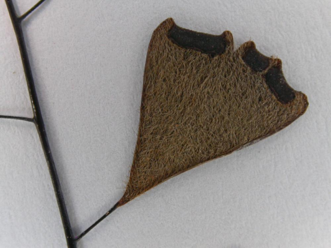 Adiantum phanomensis S.Linds. & D.J.MiddletonEtymologyNamed after the district of Thailand (Phanom) in which the type was collected. FamilyPteridaceae, subfamily Vittarioideae NomenclatureAdiantum phanomensis S.Linds. & D.J.Middleton, Harvard Pap. Bot. 8: 137. 2004. – Type: Thailand, Surat Thani, Amphoe Phanom, Khlong Phanom National Park, c.100 m alt., 11 Aoril 2003, Middleton et al. 2133 (holo BKF; iso A, BKF). DescriptionLithophytic on soft eroding limestone. Rhizome short, erect, covered with scales; scales narrow, black with a brown margin, 2–3 mm long, 0.1–0.2 mm wide. Stipe dark brown, 0.5–5.8 cm long, glabrous or with few scales near base. Laminae simply pinnate, 3–13 cm long, 1.4–4 cm wide, oblong in outline; rachis glabrous; pinnae 3–12 on each side of rachis, gradually becoming slightly smaller upwards; pinnae on stalks 2–8 mm long; pinnae flabellate, 6.5–20 by 5–11 mm, base narrow forming an angle of 40–80°, margins entire and straight, flat apex only weakly lobed with a narrow, inconspicuous sinus; thin, glabrous above, densely brown to grey pubescent beneath; veins dichotomous, slightly raised above (not visible beneath due to pubescence). Sori on flat apex of lobes, 2–4 reflexed soral flaps (false indusia), elongate , 2–4 mm long. Distribution in ThailandPENINSULAR: Surat Thani. Wider DistributionEndemic to Thailand. Known only from Klong Phanom and Khao Sok National Parks. EcologyOn steep banks of soft eroding limestone. Similar speciesAdiantum gomphophyllum Baker Proposed IUCN Conservation AssessmentLeast Concern (LC). This species is geographically restricted but occurs in two well protected areas in Khao Sok and Khlong Phanom National Parks in Thailand. Voucher specimens - ThailandMiddleton et al. 4322, Surat Thani, Khao Sok National Park (E); Middleton et al. 4359 & 5550, Surat Thani, Khlong Phanom National Park (E).