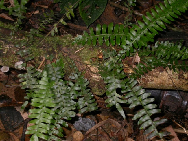 Arthropteris palisotii (Desv.) AlstonFamilyTectariaceae NomenclatureArthropteris palisotii (Desv.) Alston, Bol. Soc. Brot. II. 30: 6. 1956; Holttum, Blumea 14: 226. 1966; Holttum, Rev. Fl. Malaya, ed. 2, 2: 634. 1968; Tagawa & K.Iwats., Fl. Thailand 3: 178, f. 13.3. 1985; Boonkerd & Pollawatn, Pterid. Thailand: 237. 2000. – Aspidium palisotii Desv., Ges. Naturf. Freunde Berlin Mag. Neuesten Entdeck. Gesammten Naturk. 5: 320. 1811. Aspidium ramosum Beauv., Fl. Oware 2: 54, t. 91. 1811. – Nephrolepis ramosa (Beauv.) T.Moore, Index Filic.: 102. 1858; Bedd., Handb. Ferns Brit. India: 284, f. 145. 1883. Arthropteris obliterata auct. non (R.Br.) J.Sm.: E.Smith, J. Siam Soc. Nat. Hist. Suppl. 8: 6. 1929; Tardieu & C.Chr., Fl. Indo-Chine 7(2): 287, f. 30, 3–4. 1940; Ching, Fl. Reipubl. Popularis Sin. 2: 318, pl. 28, f. 9–11. 1959. DescriptionEpiphytic or lithophytic. Rhizome long creeping or climbing, irregularly branching, about 1.5 mm diam., bearing distant fronds; scales small, reniform with tails, 2 by 0.7 mm, dark brown, appressed. Stipes on distinct phyllopodia (a stipe base remaining as a scar after leaf-shedding) 2–3 mm high, 2–4 cm long, pubescent. Laminae linear-lanceolate, up to 40 by 7 cm, pinnate; middle pinnae larger, oblong, patent or ascending, round or moderately acute at apex, auricled at anterior and dimidiate at posterior bases, sessile, subentire or shallowly crenate at margin, up to 4 by 1 cm; rachis densely hairy; costa densely hairy above, sparsely beneath, texture softly papyraceous; veins more or less visible, forming acute angle with costa, forked. Sori in one row, submarginal or 1/3 way from margin of pinna to costa; indusia rotund-reniform smaller, usually shrinking in mature sori . Distribution in ThailandNORTHERN: Phrae, Tak; SOUTH-WESTERN: Phetchaburi; SOUTH-EASTERN: Chanthaburi; PENINSULAR: Surat Thani. Wider DistributionOld World tropics throughout, Africa to the Pacific. EcologyEpiphytic on tree trunks or on rocks in semi-shaded places. Proposed IUCN Conservation AssessmentLeast Concern (LC). This species is widespread and not under any known threats. Habit Habit |