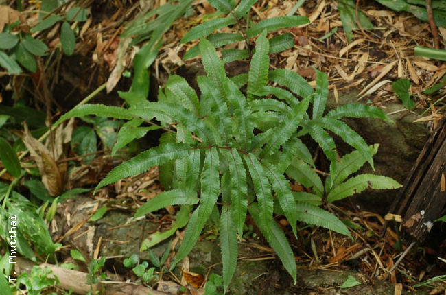 Athyrium cumingianum (C.Presl) MildeFamilyAthyriaceae NomenclatureAthyrium cumingianum (C.Presl) Milde, Bot. Zeitung (Berlin) 28: 353. 1870. – Anisocampium cumingianum C.Presl, Epimel. Bot.: 59. 1851 [‘1849’]; Tardieu & C.Chr., Fl. Indo-Chine 7(2): 281, f. 29, 2–3. 1940; Holttum, Dansk Bot. Ark. 23: 243. 1965; Tagawa & K.Iwats., SouthE. Asian Stud. 5: 101. 1967; Tagawa & K.Iwats., Fl. Thailand 3: 444, f. 47.5–7. 1988; Boonkerd & Pollawatn, Pterid. Thailand: 151, 152, 188. 2000; Newman et al., Checkl. Vasc. Pl. Lao PDR: 33. 2007. DescriptionTerrestrial. Rhizome short creeping, about 5 mm diam., more or less fleshy, scaly throughout; scales linear-subtriangular, about 3 by 1 mm. Stipes stramineous with brownish base up to 35 cm long, scaly on lower portion, hairy. Laminae imparipinnate, up to 35 by 25 cm; lateral pinnae 2–6 pairs, shortly stalked or sessile, oblong, cuspidate at apex, rounded to narrowly cuneate at base, up to 13 by 3 cm in soriferous pinnae and about 4.5 cm broad in non-soriferous ones, lobed about 1/5 way to costa; lobes oblique, rounded to obtuse at apex with sharp teeth; herbaceous, light green, glabrous or minutely hairy; terminal pinna oblong, acuminate at apex, cuneate, round or cordate at base, lobed at margin sometimes deeply in lower portion; veins pinnate, the veinlets uniting to the opposite ones of the next group, the excurrent veinlets continuous. Sori dorsal, medial, round, irregularly scattered; indusia small, thin, pale, round-reniform, margin very lacerate, usually persistent but buried amongst sporangia and not visible at maturity. Distribution in ThailandNORTHERN: Mae Hong Son, Chiang Mai, Chiang Rai, Lamphun, Lampang, Phrae, Tak, Phitsanulok; SOUTH-WESTERN: Kanchanaburi; CENTRAL: Saraburi; SOUTH-EASTERN: Prachin Buri; PENINSULAR: Phangnga. Distribution in LaosChampasak. Distribution in CambodiaMondulkiri, Stung Treng. Wider DistributionHimalaya, S India, Sri Lanka, Laos, and Philippines. EcologyOn sandy or muddy slopes in mixed forests at low to medium elevations up to 1100 m alt., usually confined to places completely exposed in the dry season. Proposed IUCN Conservation AssessmentLeast Concern (LC). This species is widespread and not under any known threats. NotesThe fleshy rhizome is similar to that of Tectaria manilensis and Tectaria tenerifrons , both of which are known in the mixed forests of seasonal areas. This seems to be an adaptive feature for survival when completely exposed in the dry season. Voucher specimens - ThailandMiddleton et al. 4969, Mae Hong Son, Namtok Pha Suea Forest Park (E). Voucher specimens - LaosMaxwell 98-1049, Champasak (CMU); Thorel s.n., Khon (P). Voucher specimens - CambodiaLong et al. CL436, Mondulkiri, Bousra Waterfall (P); Thorel s.n., Stung Treng (P). Habit Habit Habit Whole plant Rhizome Bases of stipes Base of terminal pinna from beneath with characteristic small lobe Base of terminal pinna from above with characteristic small lobe