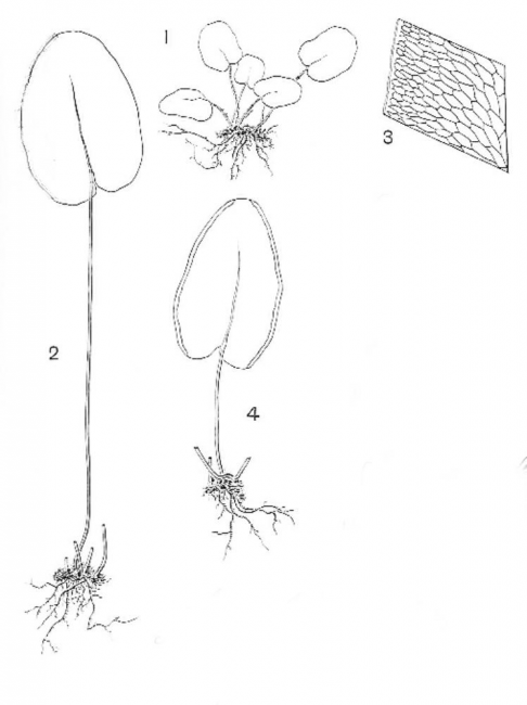 Calciphilopteris alleniae (R.M.Tryon) Yesilyurt & H.Schneid.FamilyPteridaceae, subfamily Cheilanthoideae NomenclatureCalciphilopteris alleniae (R.M.Tryon) Yesilyurt & H.Schneid., Phytotaxa 7: 55. 2010. – Doryopteris alleniae R.M.Tryon, Contr. Gray Herb. 191: 91, f.1-4. 1962; Boonkerd et al., Thai For. Bull., Bot. 32: 7. 2004. DescriptionRhizome short creeping; scales narrow, darker in the centre. Fronds slightly dimorphic. Stipes terete with one vascular bundle, c. 13–20 cm long, laminae ovate, apex rounded, base cordate or 3–5 lobed (sterile) or 3–7 lobed (fertile); sterile lamina c. 5.6–7 x 4–5 cm, no hydathodes on upper surface, margin with whitish to brownish, membranaceous border; veins copiously anastomosing, forming areoles which become smaller towards margin; fertile fronds generally shorter with stipes c. 4.2 cm long, laminae c. 5.6 x 3.4 cm. Distribution in ThailandPENINSULAR: Yala. Wider DistributionPeninsular EcologyEcology.– Lithophytic . Proposed IUCN Conservation AssessmentData Deficient (DD). The current distribution and status of this species are uncertain. 1. Sterile plant; 2. Sterile frond; 3. Venation of sterile lamina; 4. Fertile frond. |
