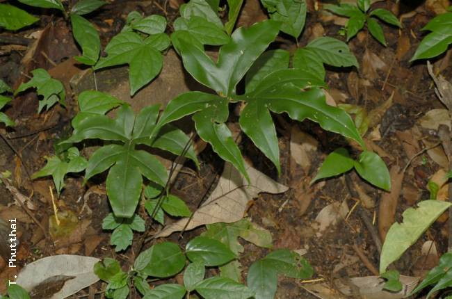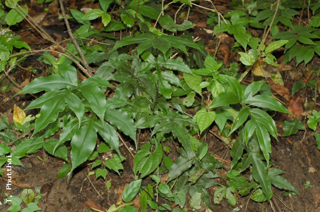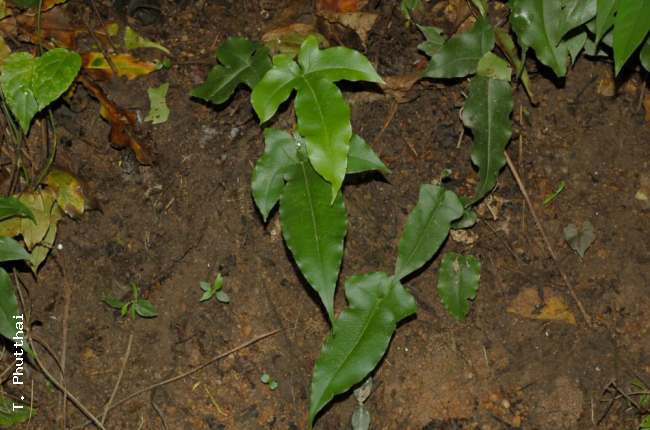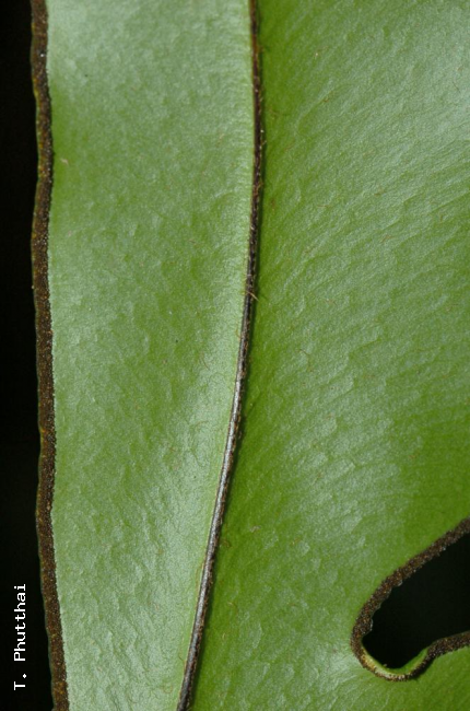 Calciphilopteris ludens (Wall. ex Hook.) Yesilyurt & H.Schneid.FamilyPteridaceae, subfamily Cheilanthoideae NomenclatureCalciphilopteris ludens (Wall. ex Hook.) Yesilyurt & H.Schneid., Phytotaxa 7: 56. 2010. – Pteris ludens Wall. ex Hook., Sp. Fil. 2: 210. 1858. – Doryopteris ludens (Wall. ex Hook.) J.Sm., Hist. Fil.: 289. 1875; Bedd., Handb. Ferns Brit. India: 120, f. 61. 1883; C.Chr.,Contr. U.S. Natl. Herb. 26: 333. 1931; Tardieu & C.Chr., Fl. Indo-Chine 7(2): 176, f. 21, 1. 1940; Tryon, Contr. Gray Herb. 143: 60, pl. 8 B, map 11. 1942; Holttum, Rev. Fl. Malaya ed. 1, 2: 594, f. 349. 1955 [‘1954’]; Holttum, Dansk Bot. Ark. 23: 243. 1965; Tagawa & K.Iwats., SouthE. Asian Stud. 5: 109. 1967; Tagawa & K.Iwats., Fl. Thailand 3: 197. 1985; Boonkerd & Pollawatn, Pterid. Thailand: 101, 123. 2000. DescriptionTerrestrial or lithophytic. Rhizome long creeping, about 3 mm diam., bearing distant stipes, covered with scales; scales linear-subulate, 3–4 mm long, distinctly bicoloured, entire, glabrous. Stipes nearly black, polished, scaly at base, sparsely hairy upwards, 20–50 cm long. Frond dimorphic; sterile lamina smaller and less lobed, 15–20 by 10–20 cm, pinnatifid with usually 5 lobes, the apical lobe the largest, or in larger fronds with a few pairs of lobes, the basal lobes the largest, with a few secondary lobes; lobes oblong-subdeltoid to triangular, acute at apex, entire or slightly waved, with distinct main veins; veins copiously reticulate without included veinlets; papyraceous, glabrous. Fertile lamina up to 20 cm long and wide, subdeltoid in outline, deeply pinnatisect, usually with three pairs of lobes, the lowest pair the largest, usually with one or two secondary lobes; lobes linear or linear subtriangular, caudately acuminate at apex, entire, 1–2 cm broad, up to 10 cm long; main veins distinct, black. Sori continuous along the margin of fronds, a very short interruption at apices of lobes, covered by thin reflexed margin . Distribution in ThailandNORTHERN: Mae Hong Son, Chiang Mai, Chiang Rai, Lampang, Phrae, Tak, Nakhon Sawan; NORTH-EASTERN: Loei; EASTERN: Nakhon Ratchasima; SOUTH-WESTERN: Kanchanaburi, Ratchaburi, Phetchaburi, Prachuap Khiri Khan; CENTRAL: Nakhon Nayok; SOUTH-EASTERN: Chon Buri, Chanthaburi; PENINSULAR: Chumphon, Surat Thani, Phangnga, Krabi, Nakhon Si Thammarat, Trang, Satun, Yala. Distribution in LaosChampasak, Luang Phrabang. Distribution in CambodiaKampot, Mondulkiri. Wider DistributionN India, S China, Indochina and throughout Malesia. EcologyTerrestrial in tropical or evergreen forests at low or medium altitudes, or lithophytic especially on limestone rocks. Proposed IUCN Conservation AssessmentLeast Concern (LC). This species is widespread and not under any known threats. Voucher specimens - ThailandMiddleton et al. 4261, Prachuap Khiri Khan, Khao Sam Roi Yot National Park (E). Voucher specimens - LaosMaxwell 98-425, Champasak (CMU). Voucher specimens - CambodiaBouillod s.n., Cambodia Unspecified (P); Long et al. CL350, Mondulkiri (P). Habit HAbit Habit Habit Lower surface of lamina nd marginal sori |