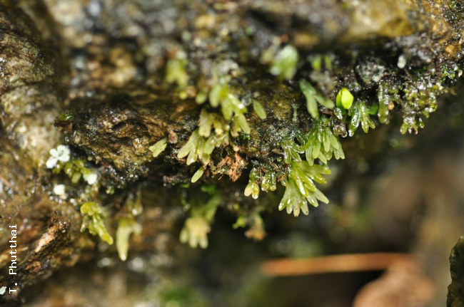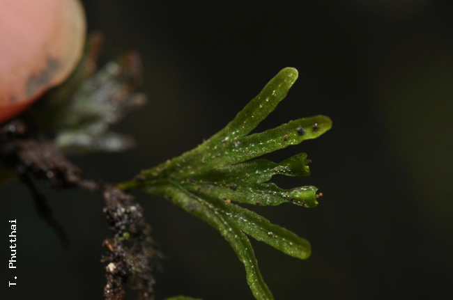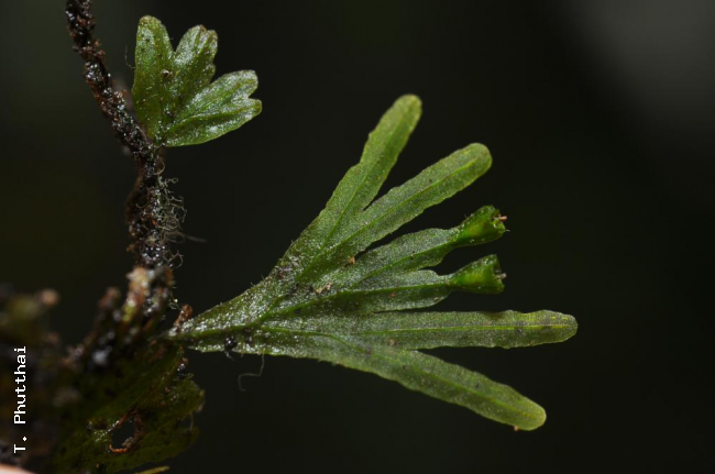 Crepidomanes megistostomum (Copel.) Copel.FamilyHymenophyllaceae NomenclatureCrepidomanes megistostomum (Copel.) Copel., Philipp. J. Sci. 67: 60. 1938; Tagawa & K.Iwats., Fl. Thailand 3: 88. 1979; Tagawa & K.Iwats., Fl. Thailand 3: 613. 1989; Boonkerd & Pollawatn, Pterid. Thailand: 71. 2000. – Trichomanes megistostomum Copel., Philipp. J. Sci. 51: 191, pl. 23, f. 4–6. 1933. – Type: Md. Haniff & Md. Nur 3981, Thailand (SING). DescriptionRhizome long creeping, filiform with numerous rhizoids. Stipes short, winged in upper part. Laminae almost digitate in appearance, bluntly quadrangular in outline, round at apex, cuneate at base, about 2 cm long including stipes of 5–8 mm in length, 1 cm wide, bipinnatifid or subdigitate, pinnae with 2–4 segments; segments round at apex, entire at margin, about 1 mm in breadth, the base decurrent to rachis, continuing to the wings on the upper part of stipes; false veinlets short, oblique or somewhat elongate between costa and margin of segments, submarginal ones wanting. Sori solitary, terminal on the ultimate segments, extruded on narrow constriction, cup-shaped, about 1.5 mm long; the mouth of involucre bilabiate . Distribution in ThailandNORTHERN: Phitsanulok; PENINSULAR: Phangnga. Wider DistributionEndemic to Thailand. EcologyOn wet rocks in tropical evergreen forest at about 500 m alt. Proposed IUCN Conservation AssessmentData Deficient (DD). This species is known from two localities quite far apart in Thailand but the overall distribution and the size of the populations is uncertain. Habit Frond Sori |