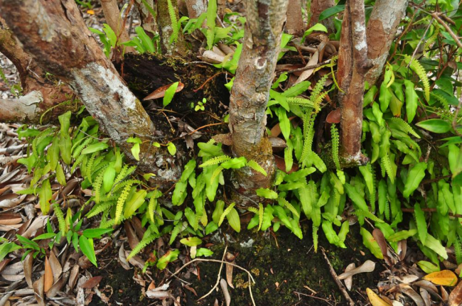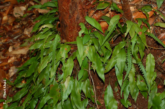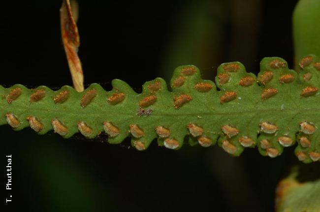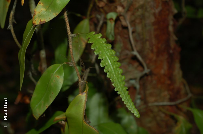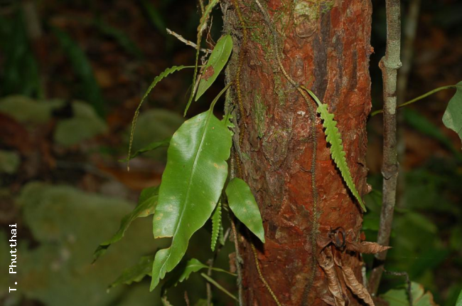 Davallia heterophylla Sm.FamilyDavalliaceae NomenclatureDavallia heterophylla Sm., Mém. Acad. Roy. Sci. (Turin) 5: 415. 1793; Tagawa & K.Iwats., Fl. Thailand 3: 616. 1989; Nooteboom, Fl. Males., Ser. II, Ferns and Fern Allies 3: 254. 1998. – Humata heterophylla (Sm.) Desv., Mém. Soc. Linn. Paris 6(3): 323. 1827; Bedd, Handb. Ferns Brit. India: 46. 1883; Bonap., Notes Ptérid. 14: 53. 1923; E.Smith, J. Siam Soc. Nat. Hist. Suppl. 8: 2. 1929; Tardieu & C.Chr., Fl. Indo-Chine 7(2): 109. 1939; Holttum, Rev. Fl. Malaya ed. 1, 2: 366, f. 211. 1955 [‘1954’]; Tagawa & K.Iwats., Fl. Thailand 3: 168. 1985; Boonkerd & Pollawatn, Pterid. Thailand: 171, 235. 2000. – Type: Charles Miller 1778 (BM). DescriptionRhizome long creeping, about 1.5 mm diam., bearing dimorphic fronds remotely, glaucous, densely scaly; scales gradually narrowing from oblong base towards long tails, up to 6 by 0.7 mm, tails usually patent, brown to darker, minutely toothed. Sterile frond: stipe 0.5–2.5 cm long, narrowly winged; lamina simple, oblong, acuminate at apex, round to cuneate at base, entire, 6–9 by 2–2.5 cm; coriaceous, naked; veins twice or thrice forked, all free. Fertile frond: stipe 1–2.5 cm long, winged; lamina linear-lanceolate, gradually narrowing towards both ends, up to 9 by 1 cm, lobed to half way; lobes patent, round, wavy. Sori terminal on veinlets, 3–5 for each lobe, a little inside the edges; indusia up to 1 mm long, 2 mm broad, brown, entire . Distribution in ThailandPENINSULAR: Surat Thani, Phangnga, Krabi, Nakhon Si Thammarat, Songkhla, Narathiwat. Wider DistributionThroughout Malesia to the Pacific, north to S Vietnam (“Cochinchina”). EcologyOn branches of trees in dense forests. Proposed IUCN Conservation AssessmentLeast Concern (LC). This species is widespread and not under any known threat. Voucher specimens - ThailandMiddleton et al. 5224, Songkhla, Ton Nga Chang Wildlife Sanctuary (E). Habit Habit Habit Habit Rhizome Sterile and fertile fronds Fertile and sterile fronds Variation from sterile (margin entire) to fertile fronds (margin lobed) and intermediate stages Sterile fronds Upper surface of fertile frond Lower surface of fertile frond Sori |
