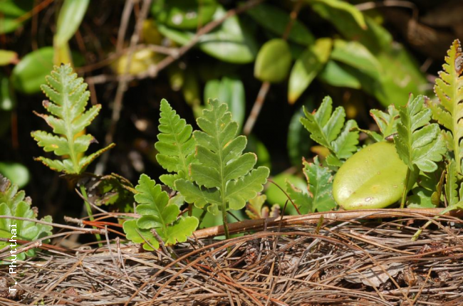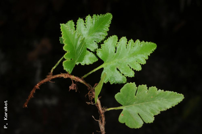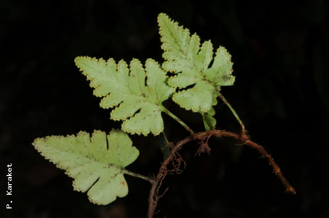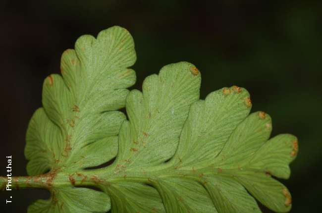 Davallia repens (L.f.) KuhnFamilyDavalliaceae NomenclatureDavallia repens (L.f.) Kuhn, Filic. Decken.: 27. 1867 nom. cons., non Desv.; Christ, Bot. Tidsskr. 24: 111. 1901; Nooteboom, Fl. Males., Ser. II, Ferns and Fern Allies 3: 259. 1998; Newman et al., Checkl. Vasc. Pl. Lao PDR: 26. 2007. – Adiantum repens L.f., Suppl. : 446. 1781. – Humata repens (L.f) Diels, Nat. Pflanzenfam. 1(4): 209. 1899; C.Chr., Bot. Tidsskr. 32: 345. 1916; Tardieu & C.Chr., Fl. Indo-Chine 7(2): 111, f. 13.1. 1939; Holttum, Rev. Fl. Malaya ed. 1, 2: 371, f. 216. 1955 [‘1954’]; Holttum, Dansk Bot. Ark. 20: 26. 1961; Holttum, Dansk Bot. Ark. 23: 235. 1965; Seidenf., Nat. Hist. Bull. Siam Soc. 19: 86. 1958; Ching, Fl. Reipubl. Popularis Sin. 2: 307, pl. 27, f. 1–5. 1959; Tagawa & K.lwats., SouthE. Asian Stud. 5: 77. 1967; Tagawa & K.Iwats., Acta Phytotax. Geobot. 23: 54. 1968; U.Sen, T.Sen & Holttum, Kew Bull. 27: 228. 1972; Tagawa & K.Iwats., Fl. Thailand 3: 166. 1985; Boonkerd & Pollawatn, Pterid. Thailand: 172, 236. 2000. – Pachypleuria repens (L.f.) M.Kato, J. Fac. Sci. Univ. Tokyo, Sect. 3, Bot. 13: 573. 1985; Tagawa & K.Iwats., Fl. Thailand 3: 616. 1989. – Type: Sonnerat par Thouin (Commerson) 74 (P holo; L), Ile de France (Mauritius). Davallia vestita Blume, Enum. Pl. Javae: 233. 1828. – Pachypleuria vestita (Blume) C.Presl, Epimel. Bot.: 261. 1851 [‘1849’]; Tagawa & K.Iwats., Fl. Thailand 3: 616. 1989. – Humata vestita (Blume) T.Moore, Index Fil.: xcii. 1857; Holttum, Rev. Fl. Malaya ed. 1, 2: 370, f. 215. 1955 [‘1954’]; Tagawa & K.Iwats., SouthE. Asian Stud. 5: 77. 1967; Tagawa & K.Iwats., Fl. Thailand 3: 165. 1985; Boonkerd & Pollawatn, Pterid. Thailand: 236. 2000. Humata pinnatifida Bedd., Suppl. Ferns Brit. Ind.: 12. 1892. DescriptionRhizome long creeping, 1.5–2 mm diam., glabrous, densely scaly throughout; scales linear-lanceolate, acuminate at basal edge, long-acuminate at apex, 6–9 mm by 1.2 mm, brown with paler margin. Stipes stramineous, terete, up to 15 cm long, sparsely scaly. Laminae oblong-subdeltoid or roundly pentagonal, (0.6–)2.5–14(–24) by (0.5–)2–11(–14) cm, pinnatifid to tripinnatifid in basal pinnae; basal pinna the largest, asymmetrically subtriangular to oblong-subdeltoid; upper pinnae linear-subtriangular, gradually becoming smaller upwards, shallowly lobed or entire, sessile or adnate; pinnules oblong, oblique, round at apex, lobed or subentire, coriaceous, glabrous. Sori marginal, small, 1–5 on each pinnule; indusia nearly semi-circular, entire and free except for the base to 1 mm broad. Distribution in ThailandNORTHERN: Mae Hong Son, Chiang Mai, Chiang Rai, Lamphun, Lampang, Phitsanulok; NORTH-EASTERN: Loei; SOUTH-WESTERN: Kanchanaburi, Phetchaburi, Prachuap Khiri Khan; CENTRAL: Nakhon Nayok; SOUTH-EASTERN: Chanthaburi, Trat; PENINSULAR: Ranong, Surat Thani, Phangnga, Nakhon Si Thammarat, Trang, Yala. Distribution in LaosUnspecified. Distribution in CambodiaKampot. Wider DistributionWidely distributed in the tropics of the Old World: Madagascar and Seychelles, Mascarene Islands, Himalayas to S Japan, SE Asia generally, throughout Malesia to Polynesia and Australia. EcologyOn mossy tree trunks or on rather dry rocks in half-shaded places in dense forests at 1000–1600 m alt. Proposed IUCN Conservation AssessmentLeast Concern (LC). This species is widespread and not under any known threat. Voucher specimens - ThailandMiddleton et al. 5076, Phitsanulok, Phu Hin Rong Kla National Park (E). Voucher specimens - CambodiaMartin 1140, Kampot (P). Habit Habit Habit Habit Rhizome and fronds from above Rhizome and fronds from beneath Frond from beneath Lower surface of Lamina with sori |