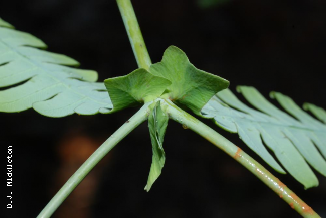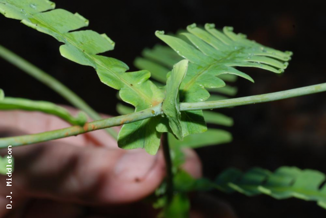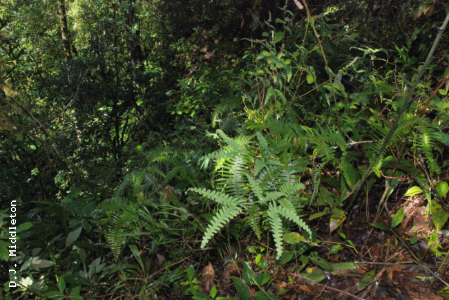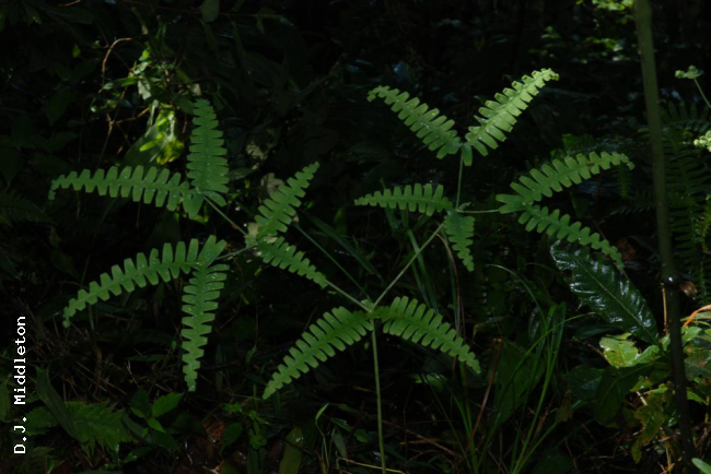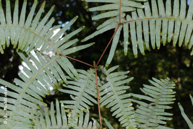 Dicranopteris splendida (Hand.-Mazz.) TagawaFamilyGleicheniaceae NomenclatureDicranopteris splendida (Hand.-Mazz.) Tagawa, Acta Phytotax. Geobot. 8: 164. 1939; Ching, Fl. Reipubl. Popularis Sin. 2: 121. 1959; Tagawa & K.Iwats., SouthE. Asian Stud. 5: 35. 1967; Tagawa & K.Iwats., Fl. Thailand 3: 54. 1979; Boonkerd & Pollawatn, Pterid. Thailand: 80. 2000. – Gleichenia splendida Hand.-Mazz., Akad. Wiss. Abh. Math.-Naturwiss. Kl. 61: 81. 1924; Tardieu & C.Chr., Fl. Indo-Chine 7(2): 50. 1939. Dicranopteris ampla Ching & Chiu, ActaPhytotax. Sin. 8: 132. 1959; Ching, Fl. Reipubl. Popularis Sin. 2: 117. 1959. DescriptionTerrestrial. Rhizome dichotomously branched, near the apex protected by peltate scales, long creeping, about 4 mm in diameter, densely hairy with shining brown stiff hairs. Fronds of mature plants usually with indefinite growth in length, bearing primary branches in pairs. Stipes about 50 cm long, stramineous or brown, glabrescent. Pinnae twice forked; ultimate lobes bearing no accessory branches, narrowly oblong, 30–45 cm long, up to 17 cm wide; ultimate segments linear, round to moderately acute at apex, entire and usually flat at margin, to 10 cm long, 1 cm broad; costules 1–1.3 cm apart; veins pinnate, distinct on both surfaces, texture rigid, green, glabrous, lower surface glaucous. Sori more than one row at each side of costules. Distribution in ThailandNORTHERN: Chiang Mai, Lampang; PENINSULAR: Krabi, Nakhon Si Thammarat. Distribution in LaosXieng Khouang. Wider DistributionKhasia, Upper Burma, S and SW China, and Indochina. Khao Luang is the southern limit of the distribution of this species ; not recorded from Malesia. EcologyOn clayey slopes along paths in half-shaded places at edge of deep primitive forest at medium altitudes. Proposed IUCN Conservation AssessmentLeast Concern (LC). This species is very widespread. Voucher specimens - ThailandMiddleton et al. 5576, Lampang, Chae Son National Park (E). Habit Young frond Lower surface of frond Node within frond Node within frond |
