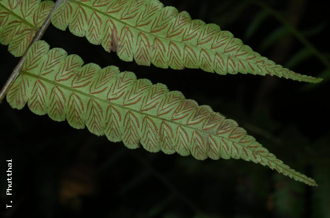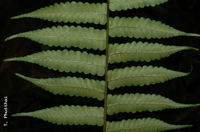 Diplazium simplicivenium HolttumFamilyAthyriaceae NomenclatureDiplazium simplicivenium Holttum, Gard. Bull. Straits Settlem. 11: 100. 1940; Tagawa & K.Iwats., SouthE. Asian Stud. 3(3): 88. 1965; Tagawa & K.Iwats., SouthE. Asian Stud. 5: 106. 1967; Tagawa & K.Iwats., Fl. Thailand 3: 464. 1988; Boonkerd & Pollawatn, Pterid. Thailand: 195. 2000. – Athyrium simplicivenium (Holttum) Holttum, Rev. Fl. Malaya ed. 1, 2: 573, f. 340. 1955 [‘1954’]; Holttum, Dansk Bot. Ark. 20: 32. 1961. DescriptionRhizome massive, erect, bearing a tuft of gigantic fronds; scales about 20 by 2 mm, brown, black-margined, toothed. Stipes up to 1 m long, about 2 cm diam. near base. Frond about 1.4 by 1 m, bipinnate; lower pinnae about 60 by 25 cm, narrowly oblong with acute apex; larger pinnules shortly stalked to sessile, narrowly subtriangular, gradually narrowing towards a acuminate apex, smaller ones rounded to acute, broadly cuneate to subtruncate or subcordate at base, usually shallowly lobed, up to 12 by 2.5 cm; lobes subquadrangular, obtuse at apex, subentire, 5–8 mm in breadth; softly papyraceous, green, shiny above; veins pinnate with 4–6 pairs of simple veinlets; veinlets hardly reaching the margin of lobes, basal anterior ones stopping far below the sinus. Sori about 8 mm long. Distribution in ThailandSOUTH-WESTERN: Uthai Thani, Kanchanaburi, Phetchaburi; SOUTH-EASTERN: Trat; PENINSULAR: Surat Thani, Phangnga, Nakhon Si Thammarat, Trang, Satun, Yala. Wider DistributionPeninsular Malaysia and probably also in Borneo. EcologyOn moist mountain slopes in dense evergreen forests at medium elevations at 400–1500 m alt. Similar speciesDiplazium dilatatum Blume Proposed IUCN Conservation AssessmentLeast Concern (LC). This species is widespread and not under any known threat. Habit Pinnae Lower surface of pinna Young sori Young sori Mature sori |
