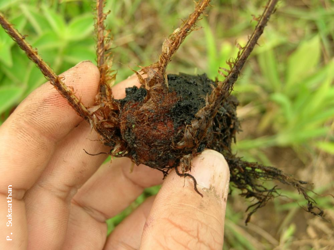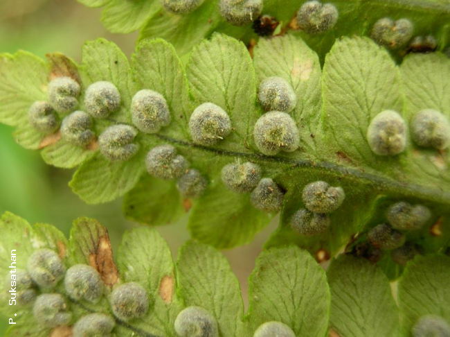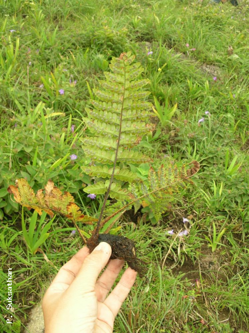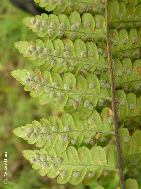 Dryopteris neochrysocoma ChingFamilyDryopteridaceae NomenclatureDryopteris neochrysocoma Ching, Lingnan Sci. J. 21: 31. 1945; Tagawa & K.Iwats., SouthE. Asian Stud. 5: 95. 1967; Tagawa & K.Iwats., Fl. Thailand 3: 348, f. 31.8 & 31.9. 1988; Boonkerd & Pollawatn, Pterid. Thailand: 204. 2000. DescriptionRhizome short, ascending; scales dense, membranous, light brown, more than 1 cm long, up to 1.2 mm broad. Stipes few at apex of rhizome, stramineous, about 8 cm long, scaly throughout; scales not very dense, lanceolate, up to 8 by 0.8 mm, gradually becoming smaller upwards. Laminae bipinnatifid, oblong-lanceolate, gradually narrowing towards both ends, 20–25 by 8–12 cm at widest middle portion; pinnae about a dozen pairs, lower pinnae slightly reduced, more or less reflexed, middle ones sessile, slightly falcate, acuminate at apex, broadly cuneate to subtruncate at base, narrowly oblong, up to 4 by 1.2 cm, deeply lobed nearly to costa; lobes oblong, slightly oblique, round to obtuse at apex and slightly toothed at apical margin, about 5 by 4 mm; papyraceous, glabrous; veins pinnate, veinlets simple or forked. Sori in a single row very close to costa; indusia large, about 2 mm diam., perfectly covering and embracing the sori , breaking down irregularly at maturity. Distribution in ThailandNORTHERN: Chiang Mai, Uttaradit. Wider DistributionS China and E Himalaya. EcologyOn mountain slopes in dense evergreen forests at high altitudes. Proposed IUCN Conservation AssessmentLeast Concern (LC). This species is widespread and not under any known threat. Habit Whole plant Rhizome Pinnae Pinnae with young sori Sori |