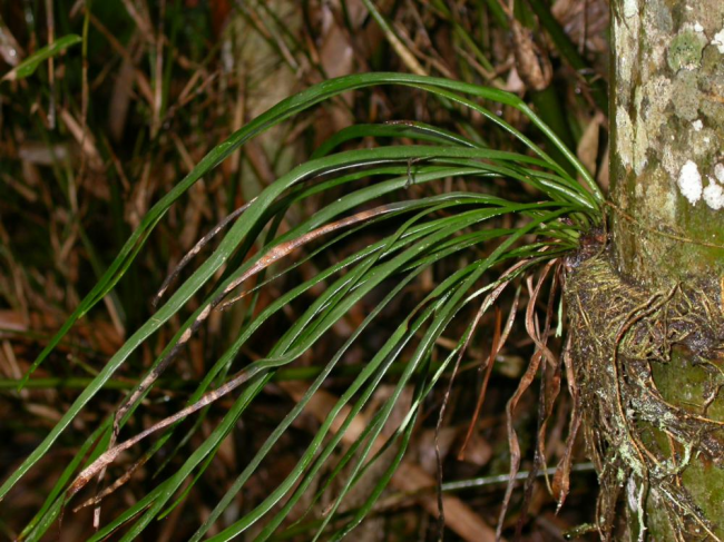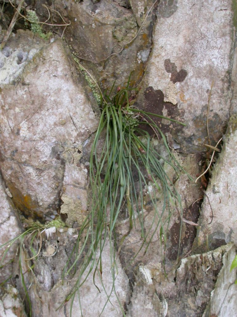 Haplopteris ensiformis (Sw.) E.H.CraneFamilyPteridaceae, subfamily Vittarioideae NomenclatureHaplopteris ensiformis (Sw.) E.H.Crane, Syst. Bot. 22: 514. 1998 [‘1997’]. – Vittaria ensiformis Sw., Ges. Naturf. Freunde Berlin Neu. Schr. 2: 134, t. 7, f. 1. 1799; Holttum, Rev. Fl. Malaya ed. 1, 2: 613, f. 359. 1955 [‘1954’]; Holttum, Dansk Bot. Ark. 20: 34. 1961; Tagawa & K.Iwats., Fl. Thailand 3: 223. 1985; Boonkerd & Pollawatn, Pterid. Thailand: 135. 2000. Vittaria hainanensis C.Chr. ex Ching, Sinensia 1: 182, pl. 1. 1931; Tardieu & C.Chr., Fl. Indo-Chine 7(2): 198. 1940. DescriptionRhizome short creeping, slender, 0.7–1.5 mm diam., densely covered with a mass of roots, scaly throughout; scales linear, gradually narrowing from base towards tailed apex, up to 7 by 0.7 mm, dark brown to nearly black, clathrate, minutely toothed at margin. Stipes usually indistinct, narrowly winged throughout. Laminae linear, up to 40 by 2.5–6 mm, leathery; costa indistinct below or hardly visible on the lower portion, other veins indistinct, the margin sometimes inrolled. Sori immersed in deep grooves almost at margin, usually elongate along both margin of fronds. Distribution in ThailandSOUTH-WESTERN: Phetchaburi, Prachuap Khiri Khan; CENTRAL: Bangkok; SOUTH-EASTERN: Chanthaburi, Trat; PENINSULAR: Ranong, Surat Thani, Phangnga, Phuket, Krabi, Nakhon Si Thammarat, Phatthalung, Trang, Satun, Pattani, Yala. Distribution in CambodiaKoh Kong. Wider DistributionTropics of the Old World, the boundary is not certain. EcologyOn tree trunks usually in dense evergreen forests at low or medium altitudes. Proposed IUCN Conservation AssessmentLeast Concern (LC). This species is widespread and not under any known threat. Voucher specimens - ThailandMiddleton et al. 5413, Phatthalung, Lan Mom Jui Waterfall (E). Voucher specimens - CambodiaViboth R5-41, Koh Kong, Thma Baing (P). Habit Habit Mature (green) and young (red) fronds Rhizome Sori |