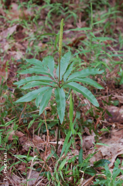 Helminthostachys zeylanica (L.) Hook.FamilyOphioglossaceae NomenclatureHelminthostachys zeylanica (L.) Hook., Gen. Fil: t. 47b. 1840; Bedd., Handb. Ferns Brit. India: 467, f. 292. 1883; E.Smith, J. Siam. Soc. Nat. Hist. Suppl. 8: 9. 1929; Clausen, Mem. Torrey Bot. Club 19(2): 108, f. 20. 1938; Tardieu & C.Chr., Fl. Indo-Chine 7(2): 10, f. 1.1 & 1.2. 1939; Holttum, Rev. Fl. Malaya ed. 1, 2: 42, f. 2. 1955 [‘1954’]; Seidenf., Nat. Hist. Bull. Siam Soc. 19: 85. 1958; Ching, Fl. Reipubl. Popularis Sin. 2: 26, pl. 1, f. 7 & 8. 1959; Tagawa & K.Iwats., SouthE. Asian Stud. 5: 32. 1967; Tagawa & K.Iwats., Fl. Thailand 3: 38. 1979; Boonkerd & Pollawatn, Pterid. Thailand: 23, 65. 2000; Newman et al., Checkl. Vasc. Pl. Lao PDR: 29. 2007. – Osmunda zeylanica L., Sp. Pl. 1063. 1753. DescriptionRhizome creeping, up to 7 mm in diameter, bearing the numerous fleshy roots and a frond in each year. Phyllomophore 20–40 cm long, fleshy, green or purplish brown; trophophyll up to 20 cm long, 30 cm wide, tripartite, each with a terminal lobe and one or two pairs of sessile lateral lobes, rachis winged; lobe oblong to oblong-lanceolate, round to acute at apex, cuneate and more or less decurrent at base, up to 20 cm long, 5 cm broad; veinlets once or twice forked, all free; texture softly herbaceous. Sporophyll with stalks up to 15 cm in length, placed at base of tripartite trophophyll, spikes up to 20 cm long; with numerous short branches bearing round sessile sporangia . Distribution in ThailandNORTHERN: Chiang Mai, Chiang Rai, Lampang; NORTH-EASTERN: Loei; SOUTH-WESTERN: Kanchanaburi; SOUTH-EASTERN: Chanthaburi; PENINSULAR: Ranong, Surat Thani, Phangnga, Nakhon Si Thammarat, Trang, Songkhla, Yala, Narathiwat. Distribution in LaosAttapeu, Champasak, Khammouane, Savannakhet, Vientiane. Distribution in CambodiaKandal, Ratanakiri, Siem Riep. Wider DistributionPalaeotropics, from Sri Lanka and India (Assam) to New Caledonia and Queensland. EcologyTerrestrial on humus-rich slopes in light shade at low or medium altitudes. Proposed IUCN Conservation AssessmentLeast Concern (LC). This species is widespread and not under any known threat. Voucher specimens - ThailandMaxwell 86-803, Songkhla, Natawee (P); Larsen et al. 43028, Yala, Khao Yai, Jaha (P). Voucher specimens - LaosMaxwell 07-199, Savannakhet (CMU); Vidal 2309, Vientiane (P); Leong-Skornickova et al. 1829, Vientiane capital (E). Voucher specimens - CambodiaDavid et al. CL861, Ratanakiri, Norn Kabat forest (P). Habit Whole plant Young frond Trophophyll (sterile part of frond) with stalk of sporophyll (fertile part of frond) Spike Sporophyll with sessile sporangia |