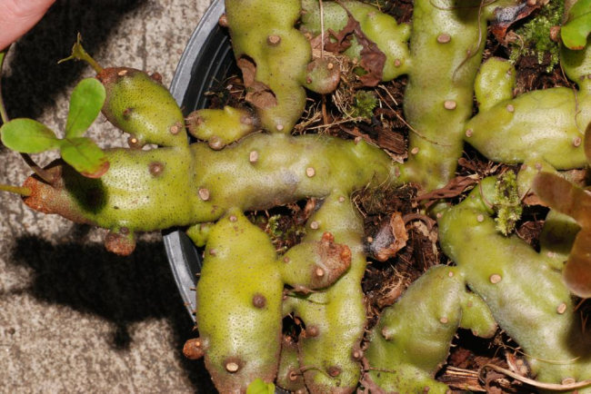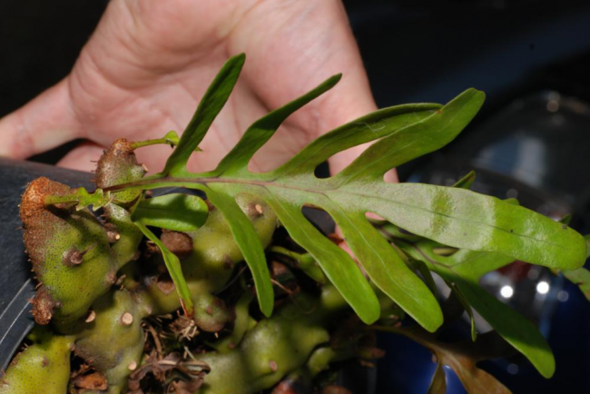 Lecanopteris crustacea Copel.FamilyPolypodiaceae NomenclatureLecanopteris crustacea Copel., Univ. Cal. Publ. Bot. 12: 406. 1931; Hennipman & Hovenkamp, Fl. Males., Ser. II, Ferns and Fern Allies 3: 61. 1998; Boonkerd & Pollawatn, Pterid. Thailand: 272. 2000. – Phymatodes crustacea (Copel.) Holttum, Rev. Fl. Malaya ed. 1, 2: 190. 1955 [‘1954’]. – Myrmecophila crustacea (Copel.) Tagawa, Acta Phytotax. Geobot. 22: 190. 1967; Tagawa & K.Iwats., Acta Phytotax. Geobot. 24: 175. 1970; Tagawa & K.Iwats., Fl. Thailand 3: 535, f. 54.1 & 54.2. 1989. – Type: Burchard 158 (UC). DescriptionRhizome fleshy, swollen, hollow and ant-inhabited, 3–5 cm in thickness, scaly; scales circular, 2–3 mm diam., bi-coloured, clathrate. Fronds slightly dimorphic. Stipes 4–18(–28) cm long, scaly at base, glabrescent above. Laminae narrowly elliptic, 12–60 by 8–20 cm, pinnatifid; pinnae linear, up to 7 by 0.5 cm, broadest in apical portion, round at apex, subentire, decurrent at base and connected to the next by very narrow wings; papyraceous, glabrous; veins anastomosing, hardly visible. Sori large, oblong, up to 2 mm in length, in shallow hollow at each side of costae , raised on upper surface. Distribution in ThailandPENINSULAR: Ranong, Surat Thani. Wider DistributionPeninsular Malaysia, Sumatra and Borneo. EcologyEpiphytic on tree trunks or on rocks at low altitudes. Proposed IUCN Conservation AssessmentLeast Concern (LC). This species is widespread and not under any known threat. Rhizome Rhizome and stipe bases Frond |
