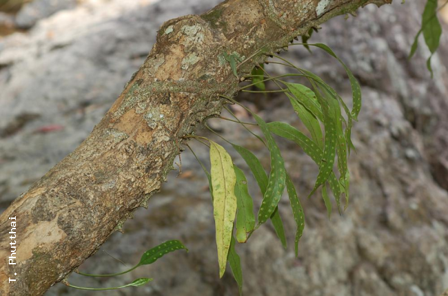 Lecanopteris sinuosa (Wall. ex Hook.) Copel.FamilyPolypodiaceae NomenclatureLecanopteris sinuosa (Wall. ex Hook.) Copel., Univ. Calif. Publ. Bot. 16: 123. 1929; Hennipman & Hovenkamp, Fl. Males., Ser. II, Ferns and Fern Allies 3: 64. 1998; Boonkerd & Pollawatn, Pterid. Thailand: 272. 2000; Leti et al., Fl. Photogr. Cambodge 558. 2013. – Polypodium sinuosum Wall. ex Hook., Sp. Fil. 5: 61, t. 284. 1863; Christ, Bot. Tidsskr. 24: 105. 1901; C.Chr., Bot. Tidsskr. 32: 348. 1916. – Phymatodes sinuosa (Wall. ex Hook.) J.Sm., Ferns Brit. For. ed. 2: 296. 1877; Tardieu & C.Chr., Fl. Indo-Chine 7(2): 470. 1941; Holttum, Rev. Fl. Malaya ed. 1, 2: 190. 1955 [‘1954’]; Holttum, Dansk Bot. Ark. 20: 21. 1961; Seidenf., Nat. Hist. Bull. Siam Soc. 19: 86. 1958. – Pleopeltis sinuosa (Wall. ex Hook.) Bedd., Ferns Brit. India: t. 8. 1865; Bedd., Handb. Ferns Brit. India: 349, f. 195. 1883. – Myrmecophila sinuosa (Wall. ex Hook.) Nakai ex H.Ito, J. Jap. Bot. 11: 98. 1935; Ching, Sunyatsenia 5: 259. 1940; Tagawa & K.Iwats., SouthE. Asian Stud. 3(3): 78. 1965; Tagawa & K.Iwats., SouthE. Asian Stud. 5: 54. 1967; Tagawa & K.Iwats., Fl. Thailand 3: 535. 1989. – Type: Wallich 2231 (K), Malacca. DescriptionRhizome creeping, thick, 1–1.5(–2) cm diam., hollow and ant-inhabited, bearing two rows of fronds usually about 1.5 cm apart on tall phyllopodia of more than 5 mm in height, densely scaly; scales circular, about 3 mm diam., attached at central point, central portion about 1 mm diam., dark brown, clathrate with thick internal walls, the margin white consisting of narrow cells. Stipes 3–8 cm long, winged on uppermost portion. Laminae simple, oblong to linear, round to moderately acute at apex, cuneate to broadly attenuate at base, 15–38 by 3.5 cm in sterile and 0.7– 1.5 cm broad in fertile ones, subentire or slightly wavy at margin; midrib raised on both surfaces, veins visible, copiously anastomosing; papyraceous. Sori medial or submarginal, in one row at each side of midrib, round to oblong , about 3.5 mm broad at maturity, in a distinct hollow which raised is on upper surface. Distribution in ThailandEASTERN: Nakhon Ratchasima; SOUTH-WESTERN: Phetchaburi; SOUTH-EASTERN: Chanthaburi, Trat; PENINSULAR: Chumphon, Krabi, Nakhon Si Thammarat, Trang, Satun, Yala. Distribution in CambodiaKampot, Koh Kong, Mondulkiri. Wider DistributionSumatra and Peninsular Malaysia to New Hebrides and the Solomon Islands, north to Cambodia and Vietnam. EcologyOn tree trunks in light shade or in open places at low altitudes. Proposed IUCN Conservation AssessmentLeast Concern (LC). This species is widespread and not under any known threat. Voucher specimens - ThailandMiddleton et al. 4623, Trat, Ko Chang, Trail from Khlong Phlu Ranger Station (E). Voucher specimens - CambodiaLong et al. CL456, Mondulkiri (P); Long et al. CL501, Koh Kong (P). Habit Network of rhizomes around a branch Rhizome attached to twig Cross section through rhizomes showing hollow interior Rhizome and stipe bases Frond Lower surface of frond with immature sori Cut open rhizome with ants' eggs. Lower surface of frond with mature sori |
