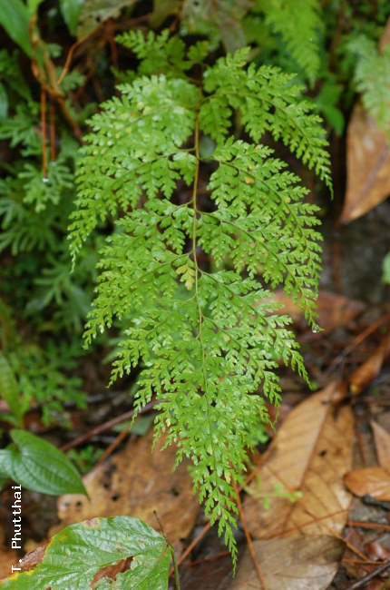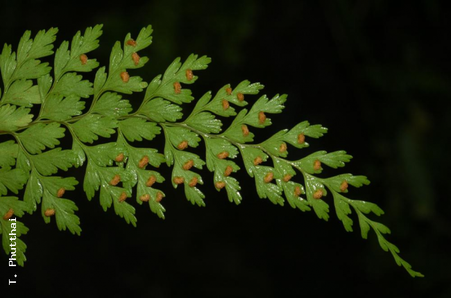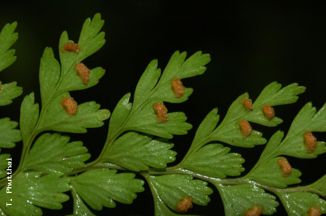 Leucostegia immersa C.PreslFamilyDryopteridaceae NomenclatureLeucostegia immersa C.Presl, Tent. Pterid.: 95, t. 4, f. 11. 1836; Bedd., Handb. Ferns Brit. India: 51. 1883; C.Chr., Contr. U.S. Natl. Herb. 26:331. 1931; Tardieu & C.Chr., Fl. Indo-Chine 7(2): 113. 1939; Holttum, Rev. Fl. Malaya ed. 1, 2: 352. 1955 [‘1954’]; Ching, Fl. Reipubl. Popularis Sin. 2: 296, pl. 26, f. 1–3. 1959; Tagawa & K.Iwats., SouthE. Asian Stud. 5: 76. 1967; Tagawa & K.Iwats., Fl. Thailand 3: 169, f. 12.5. 1985; Nooteboom, Fl. Males., Ser. II, Ferns and Fern Allies 3: 274, f. 3. 1998; Boonkerd & Pollawatn, Pterid. Thailand: 172, 173, 236. 2000. – Davallia immersa (C.Presl) Wall. ex Hook., Sp. Fil. 1: 156. 1846. – Acrophorus immersus (C.Presl) T.Moore, Proc. Linn. Soc. London 2: 286. 1854. – Humata immersa (C.Presl) Mett., Fil. Hort. Bot. Lips. 102. 1856. – Type: Wallich 256 (K, L, P), Nepal, 1821. DescriptionRhizome long creeping, bearing fronds remotely; hairs rather dense, golden-yellow, multicellular, wooly; scales narrowly lanceolate, up to 4 by 0.4 mm, light brown, membranous, entire at margin. Stipes stramineous or brownish on lower surface, scaly at base, glabrescent upwards, up to 39 cm long. Laminae oblong, acuminate at apex, quadripinnatifid, up to 40 by 25 cm; pinnae more than 10 pairs, the lowest the largest, with distinct petioles, lower ones asymmetrically oblong-subdeltoid, acuminate at apex, broadly cuneate at base, up to 15 cm long and wide; pinnules oblong to subdeltoid on stalks in larger ones, secondary pinnules oblong or narrower, with 1–6 segments; ultimate segments circular to oblong or terminal ones spathulate, coarsely dentate at margin; thin herbaceous, light green, glabrous. Sori terminal on veinlets, one to each segment; indusia circular, attached only by base, entire, 1.3–2 mm broad, white to pale brown, glabrous . Distribution in ThailandNORTHERN: Chiang Mai, Chiang Rai, Lamphun, Tak, Phitsanulok; NORTH-EASTERN: Loei; SOUTH-WESTERN: Kanchanaburi; PENINSULAR: Surat Thani. Distribution in CambodiaKompong Speu Wider DistributionS India, E Himalayas, SW China, Burma, Indochina, W Malesia to the Philippines, north to Taiwan. EcologyTerrestrial on mountain-slopes or in muddy crevices of rocks, or rarely low down on mossy tree trunks, usually in dense evergreen forests or in half-shaded places at high altitudes (1100– 1800 m). Proposed IUCN Conservation AssessmentLeast Concern (LC). This species is widespread and not under any known threat. Voucher specimens - ThailandMiddleton et al. 4472, Chiang Mai, Doi Suthep-Doi Pui National Park (E); Middleton et al. 4937, Chiang Mai, Doi Pha Ti Do (E). Voucher specimens - CambodiaPierre 5774, Kompong Speu, Khnang Krapeu (P). Habit Habit Rhizome Frond Frond apex Pinnae Lower surface of lamina Pinnae Sori Sori |