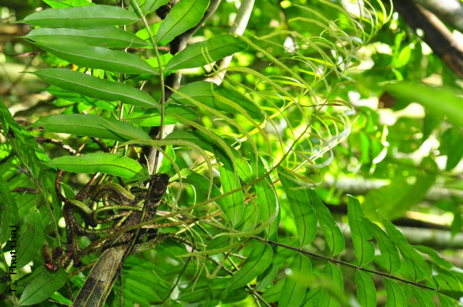 Lomariopsis lineata (C.Presl) HolttumFamilyLomariopsidaceae NomenclatureLomariopsis lineata (C.Presl) Holttum, Novit. Bot. Inst. Prag. 1968: 9. 1969; Holttum, Fl. Males., Ser. II, Pterid. 1: 262. 1978; Tagawa & K.Iwats., Fl. Thailand 3: 325, f. 27.8–27.11. 1988; Boonkerd & Pollawatn, Pterid. Thailand: 187. 2000. – Olfersia lineata C.Presl, Tent. Pterid.: 235. 1836. Lomariopsis cochinchinensis Fée, Mém. Foug., 2. Hist. Acrostich.: 66, t. 26. 1845; Holttum, Gard. Bull. Straits Settlem. 9: 266. 1937; Tardieu & C.Chr., Fl. Indo-Chine 7(2): 428, f. 49, 1–2. 1941; Holttum, Rev. Fl. Malaya ed. 1, 2: 476, f. 279. 1955 [‘1954’]. – Stenochlaena cochinchinensis (Fée) Underw., Bull. Torrey Bot. Club 33. 46, 1906. 1906 DescriptionRhizome creeping, climbing, scaly; scales oblong-lanceolate, brown, up to 10 by 3 mm, entire. Stipes about 20 cm long, densely scaly at base. Laminae oblong-lanceolate, simply pinnate, up to 60 by 30 cm; pinnae 15–20 pairs, jointed to rachis except for the terminal one, lower ones stalked, lanceolate, up to 20 by 2–4 cm; veins distinct on both surfaces. Fertile pinnae linear, 8–15 cm long, up to 6 mm broad, stalked. Sporangia dispersed on the lower surface except on midrib . Distribution in ThailandSOUTH-EASTERN: Prachin Buri; PENINSULAR: Phangnga, Yala. Distribution in CambodiaKampot, Koh Kong Wider DistributionBurma, Indochina, Malaya, Sumatra, Java, Borneo, Philippines, and New Guinea. EcologyLong climber on trees at low altitude, 210–350 m alt. Similar speciesStenochlaena palustris (Burm.f.) Bedd. Proposed IUCN Conservation AssessmentLeast Concern (LC). This species is widespread and not under any known threat. Rhizome creeping up tree Crozier Sterile and fertile pinnae |