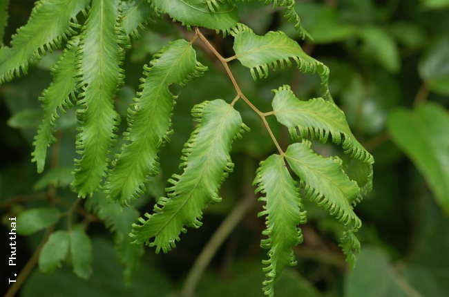 Lygodium salicifolium C.PreslFamilyLygodiaceae NomenclatureLygodium salicifolium C.Presl, Suppl. Tent. Pterid.: 102. 1845; C.Chr., Bot. Tidsskr. 32: 349. 1916; E.Smith, J. Siam Soc. Nat. Hist. Suppl. 8: 8. 1929; Tardieu & C.Chr., Fl. Indo-Chine 7(2): 41. 1939; Holttum, Fl. Males., Ser. II, Pterid. 1: 51, f. 6, 10 & 13a–b. 1959; Holttum, Dansk Bot. Ark. 20:16. 1961; Holttum, Dansk Bot. Ark. 23: 228. 165; Holttum, Rev. Fl. Malaya, ed. 2, 2: 630. 1968; Seidenf., Nat. Hist. Bull. Siam Soc. 19: 85. 1958; Ching, Fl. Reipubl. Popularis Sin. 2: 111, pl. 7, f. 7–9. 1959; Tagawa & K.Iwats., SouthE. Asian Stud. 3(3): 72. 1965; Tagawa & K.Iwats., SouthE. Asian Stud. 5: 34. 1967; Tagawa & K.Iwats., Acta Phytotax. Geobot. 23: 51. 1968; Tagawa & K.Iwats., Fl. Thailand 3: 64. 1979; Boonkerd & Pollawatn, Pterid. Thailand: 35, 83. 2000; Newman et al., Checkl. Vasc. Pl. Lao PDR: 28. 2007. Lygodium flexuosum auct. non (L.) Sw.: Christ, Bot. Tidsskr. 24 112. 1901; Holttum, Rev. Fl. Malaya ed. 1, 2: 57. 1955 [‘1954’], p.p. Lygodium circinnatum auct. non (Burm.f.) Sw.: Christ, Bot. Tidsskr. 24: 112. 1901; Hosseus, Beih. Bot. Centralbl. 28(2): 367. 1911; C.Chr., Bot. Tidsskr. 32: 349. 1916; Seidenf., Nat. Hist. Bull. Siam Soc. 19: 85. 1958. DescriptionRhizome shortly creeping, densely covered with blackish brown hairs. Fronds very large, climbing, to several. metres tall; stipes stramineous, minutely pubescent, very narrowly winged or with a distinct line at both sides; rachis like the upper part of stipes, 1.5–2.2 mm diam.; primary rachis-branches very short, up to 4 mm long, the apex dormant, covered with brown hairs; secondary rachis-branches pinnate (rarely basal branches slightly bipinnate with two small free lobes and one large terminal lobe), with about 4 pairs of leaflets and a terminal usually deeply lobed one; tertiary leaflets oblong-lanceolate, moderately acute at apex, cordate, subauricled, subhastate or in extreme form 5-lobed at base, minutely dentate at margin, typically 10 cm long but up to 17 cm, 2.5 cm broad; stalks of leaflets distinct but wanting in smaller leaflets, up to 1.2 cm long, with a distinct junction at base of laminae; lamina herbaceous to soft papyraceous, fresh green, almost glabrous on both surfaces except the hairy margin; every axis higher than the secondary rachis-branches with narrow but distinct wings, pubescent throughout, somewhat swollen at every junction. Sporangia-bearing lobes protruding at margin of tertiary leaflets, 2–5(–10) mm long, about 1.2 mm broad; indusia glabrous . Distribution in ThailandNORTHERN: Chiang Mai, Chiang Rai, Phayao, Lampang, Phrae, Sukhothai; NORTH-EASTERN: Loei; EASTERN: Nakhon Ratchasima; SOUTH-WESTERN: Kanchanaburi, Prachuap Khiri Khan; CENTRAL: Nakhon Nayok; SOUTH-EASTERN: Chon Buri, Chanthaburi, Trat; PENINSULAR: Surat Thani, Phangnga, Nakhon Si Thammarat, Phatthalung, Trang, Satun, Yala, Narathiwat. Distribution in LaosKhammouane, Luang Phrabang, Savannakhet, Vientiane. Distribution in CambodiaKampot, Koh Kong, Kratie, Mondulkiri, Pursat, Siem Reap. Wider DistributionIndia (Assam) to Yunnan, Indochina, Hainan, Taiwan, throughout Malesia, southeast to New Guinea and Micronesia. EcologyOn rather dry mountain slopes in tropical evergreen forest at low or medium altitudes. Proposed IUCN Conservation AssessmentLeast Concern (LC). This species is widespread and not under any known threat. NotesUses. – Stems used in making handbags and hats. Voucher specimens - ThailandPhengkhlai 43, Phrae, Huay Ton Yang (P); Phengkhlai 619, Nakhon Ratchasima, Khao Yai (P); Middleton et al. 4602, Trat, Ko Chang, Near Thanmagon Waterfall (E). Voucher specimens - LaosPedrono 79, Luang Phrabang (P); Poilane 12034, Savanakhet (P); Maxwell 99-172, Vientiane (CMU) Voucher specimens - CambodiaGeoffray 120, Kampot (P); Martin 1005, Koh Kong (P); Chevalier 31866, Kratie (P); Schnell 10292, Mondulkiri (P); Harmand 322, Pursat (P); Long et al. CL282, Siem Reap, Taprom Temple (P); Martin 1296, Siem Reap, Mt Kulen (P). Habit Apex of secondary rachis branch Secondry rachis branch Secondary rachis branch Pinnules Sori |