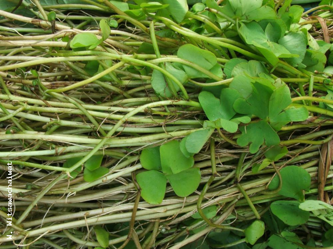 Marsilea crenata C.PreslFamilyMarsileaceae NomenclatureMarsilea crenata C.Presl, Rel. Haenk. 1: 84, t. 12, f. 13. 1825; Holttum, Rev. Fl. Malaya ed. 1, 2: 619. 1955 [‘1954’]; Holttum, Dansk Bot. Ark. 20: 35. 1961; Tagawa & K.Iwats., SouthE. Asian Stud. 5: 112. 1967; Tagawa & K.Iwats., Fl. Thailand 3: 600, f. 60.1–60.3. 1989; Boonkerd & Pollawatn, Pterid. Thailand: 97, 115. 2000; Newman et al., Checkl. Vasc. Pl. Lao PDR: 28. 2007. Marsilea minuta auct. non L.: Tardieu & C.Chr., Fl. Indo-Chine 7(2): 30. 1939; Newman et al., Checkl. Vasc. Pl. Lao PDR: 28. 2007. Marsilea quadrifolia auct. non L.: Tardieu & C.Chr., Fl. Indo-Chine 7(2): 30. 1939; Newman et al., Checkl. Vasc. Pl. Lao PDR: 28. 2007; Dy Phon, Dictionary of Plants used in Cambodia: 430. 2000. Marsilea sp. aff. M. polycarpa Hook. & Grev.: Holttum, Dansk Bot. Ark. 20: 35. 1961. DescriptionRhizome slender, long creeping, irregularly branching, bearing pale brown hairs. Stipes rather close, green, stramineous or pale brown, darker towards base, 2–3 cm long when exposed, or 6–18 cm long in immersed plants, hairy or glabrescent. Leaflets fan-shaped, round and subentire to undulate at apex, broadly cuneate at base, 0.5–2 cm both in length and in breadth, glabrous, or hairy at margin when young. Sporocarps one to several on short stalks placed at base of stipes, oblong, 2–5 mm long, covered with caducous hairs. Distribution in ThailandNORTHERN: Chiang Mai, Phitsanulok; NORTH-EASTERN: Phetchabun, Khon Kaen; EASTERN: Chaiyaphum; SOUTH-WESTERN: Kanchanaburi; CENTRAL: Bangkok; PENINSULAR: Krabi. Distribution in LaosChampasak, Vientiane. Distribution in CambodiaKompong Cham, Siem Reap. Wider DistributionOld World Tropics and Subtropics. EcologyIn paddy fields, in grooves, in streamlets, in ponds or in marshy places, usually in open sunny places, rather common throughout the country at low or medium altitudes, lower than 1000 m. IUCN Conservation AssessmentLeast Concern (LC) as listed on the IUCN Red List at http://www.iucnredlist.org/apps/redlist/details/168620/0. NotesMarsilea is in great need of critical revision. In Thailand only one species was recognised in the Flora of Thailand, namely Marsilea crenata C.Presl. However, in various works from Cambodia and Laos three species have been recognised, Marsilea minuta L., M. quadrifolia L. and M. crenata. This material is very variable and several specimens identified under the first two names are sterile and indeterminable. In the material that is determinable we can identify only one species throughout Thailand, Laos and Cambodia, which is very variable in size. We refer all of this material to Marsilea crenata pending a critical revision of the genus in Asia. Young shoots can be eaten raw. Voucher specimens - LaosThorel s.n. [P01435582], Champasak (P); Tixier s.n. [P01435606], Vientiane, Chinaimo [sterile specimen] (P). Voucher specimens - CambodiaSchmid s.n. [P01575012], Kompong Cham [sterile ] (P); Martin 128, Siem Reap [sterile ] (P).