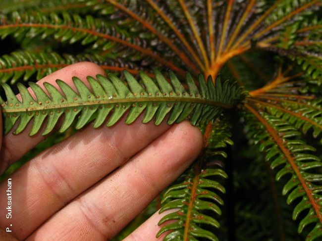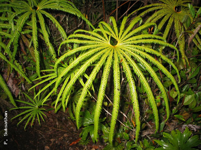 Matonia pectinata R.Br.FamilyMarsileaceae NomenclatureMatonia pectinata R.Br. in Wallich, Pl. Asiat. Rar. 1: 16, t. 16 (illustrations of the holotype). 1829; Hooker & Bauer, Gen. Fil.: t. 43 (illustrations of the holotype). 1840; Hooker, Sp. Fil.: 5: 285–286. 1864; Beddome, Ferns Brit. Ind. 2: 186, pl. 186. 1866; Beddome, Handb. Ferns. Brit. Ind.: 19 1883; Tansley & Lulham, Ann. Bot. (Oxford) 19(76): 475–519, pl. 31–33. 1905; Copeland, Sarawak Mus. J. 2(3): 388. 1917; Holttum, Rev. Fl. Malaya, ed. 1, 2: 59 & 60, f. 13. 1955 [‘1954’] (also 2: 59-60, 2nd edition, 1968); ; Kato, Blumea 38: 167–172. 1993; Kato, Fl. Males. Ser.2, Ferns and Fern Allies 3: 291. 1998; Lindsay et al., Thai For. Bull. (Bot.) 31: 47. 2004; Jaman, Fl. Pen. Malaysia, Ser. I, Ferns & Lycoph. 1: 104. 2010. – Type: Peninsular Malaysia, "Malacca, Mt. Ophir" (present day Gunung Ledang, Johor), near the summit at approximately 1200 m, 1815, Farquhar s.n. (holotype K-W, Wallich List no.184; iso CAL). DescriptionTerrestrial. Rhizome creeping, dorsiventral, tricyclic-solenostelic, 4–6 mm in diameter and densely covered with shiny orange-brown hairs, 3–3.5 mm long. Fronds: alternate in two rows on the dorsal side of the rhizome, 1–2 cm apart. Stipe 40–85 cm long, 2–3 mm diam., brown or chestnut-brown, hairy at base but glabrous and shiny above, much longer than lamina. Lamina perpendicular to stipe (umbrella-like), pedate, symmetrical, consisting of a central pinna and, on each side of that, an equal number (5–12) of 10–24 progressively shorter pinnae, 20–45 cm diameter, central pinna 15–38 cm long; pinnae pectinate, deeply lobed, linear, coriaceous; costae glabrous on top, glabrous or hairy underneath; pinna segments linear-oblong and obtuse or narrowly deltoid and acute, usually oblique and falcate, up to 2 cm long and 4–6 mm broad at base, entire, with revolute margins, shiny on top, often glaucous and papillate underneath; veins forming costal areoles, forked, free or only weakly anastomosing in sterile portions of segments, always anastomosing in soriferous portions (sori centred on small circular veins fed by 5–9 radial veinlets). Sori: on the underside of fronds, round, usually 0–3 per segment (but occasionally 4 or 5), often distributed with a bias towards the basiscopic sides of segments; indusia hemispherical, peltate, deciduous, thick in central portion and membranous and inrolled in marginal portion; sporangia 5–8 in one layer arranged in a tight circle around a prominent, persistent, receptacle; capsules subglobose-polygonal with incomplete oblique annuli. Spores: tetrahedral-globose, trilete, pale, surface granulate . Distribution in ThailandPENINSULAR: Trang, Yala. Wider DistributionPeninsular Malaysia, Riau Archipelago, Lingga Archipelago and Sumatra. EcologyIn Thailand grows only in exposed areas or in relatively open scrub on or near the tops of mountains at altitudes of 1200–1520 m. Proposed IUCN Conservation AssessmentLeast Concern (LC). Although collected only twice in Thailand this species is widespread in Malaysia and western Indonesia and not under any known threat. Habit