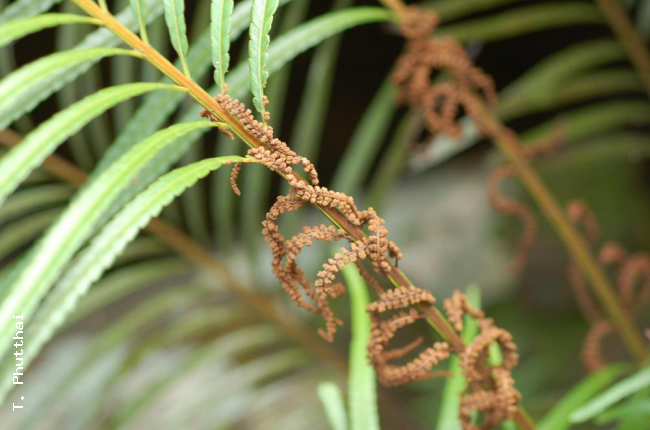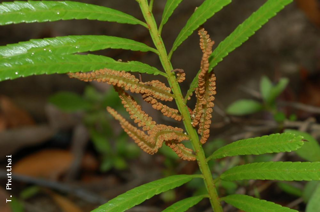 Osmunda angustifolia ChingFamilyOsmundaceae NomenclatureOsmunda angustifolia Ching, Acta Phytotax. Sin. 8: 131, 160, f. 10. 1959; Fl. Reipubl. Popularis Sin. 2: 84. 1959; Tagawa & K.Iwats. SouthE. Asian Stud. 5: 34. 1967; Tagawa & K.Iwats., Fl. Thailand 3: 45. 1979; Boonkerd & Pollawatn, Pterid. Thailand: 31, 77. 2000. DescriptionFronds congested at apex of rhizome. Stipes stramineous, short, up to 25 cm long; laminae pinnate with a distinct apical pinna, moderately acute at apex, a few pairs of basal pinnae slightly shortened; lateral pinnae linear, gradually narrowing both towards acute apex and towards shortly stalked base, less than 15 cm long, 1.2 cm broad, the margin slightly waved, the sinus usually less than 1 mm in depth; the veins two or three times dichotomously branching; texture papyraceous to softly coriaceous, fresh green in colour; a few middle pinnae fertile, contracted , brown after shedding the spores. Distribution in ThailandNORTH-EASTERN: Phetchabun, Loei; SOUTH-EASTERN: Trat. Distribution in LaosVientiane. Wider DistributionHainan, Hongkong, China (Guangdong) and Taiwan (?) EcologyOn sandy banks or on wet rocks usually along streams in dense forest or in half shaded areas at medium altitude. Proposed IUCN Conservation AssessmentLeast Concern (LC). This species is widespread and not under any known threat. Voucher specimens - LaosMunzinger 78, Vientiane, Montagne du Boeuf sacre (P). Habit Sterile pinnae Fertile pinnae Sterile and fertile pinnae |