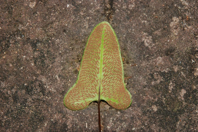 Parahemionitis cordata (Roxb. ex Hook. & Grev.) Fraser-Jenk.FamilyPteridaceae, subfamily Cheilanthoideae NomenclatureParahemionitis cordata (Roxb. ex Hook. & Grev.) Fraser-Jenk., New Sp. Syndr. Indian Pteridol. 187. 1997. – Hemionitis cordata Roxb. ex Hook. & Grev., Icon. Filic.: t. 64. 1828. Hemionitis arifolia (Burm.f.) T.Moore, Index Filic.: 114. 1859; Bedd., Handb. Ferns Brit. India: 413, f. 245. 1883; Tardieu & C.Chr., Fl. Indo-Chine 7(2): 189. 1940; Holttum, Rev. Fl. Malaya ed. 1, 2: 596. 1955 [‘1954’]; Tagawa & K.Iwats., Acta Phytotax. Geobot. 25: 19. 1971; Tagawa & K.Iwats., Fl. Thailand 3: 191. 1985; Boonkerd & Pollawatn, Pterid. Thailand: 101, 123. 2000; Newman et al., Checkl. Vasc. Pl. Lao PDR: 31. 2007. – Asplenium arifolium Burm.f., Fl. Indica: 231. 1768. DescriptionRhizome short, suberect, covered with scales; scales narrow, concolorous, brown, 2–3 mm long, entire. Stipes deep castaneous to nearly black, grooved on adaxial surface, up to 20 cm long in fertile and up to 8 cm in sterile fronds, scaly or hairy throughout, hairs multicellular, coarse, up to 1.5 mm long. Laminae distinctly dimorphic; sterile lamina simple, narrowly ovate or oblong, round at apex, deeply cordate at base, entire, up to 7 by 4 cm; thickly papyraceous to chartaceous, bearing scales and hairs on lower surface, densely hairy at margin with short multicellular hairs; costa raised on lower surface, the veins reticulate without free veinlets, obscure; fertile lobes oblong-subdeltoid, up to 5 by 3 cm, moderately acute at apex, cordate at base, the two basal lobes triangular, moderately acute, entire; thinner than the sterile. Sporangia placed along veins, forming a network all over the lower surface, without any protection but scales mixed with sporangia . Distribution in ThailandNORTHERN: Chiang Mai, Phitsanulok; NORTH-EASTERN: Khon Kaen; EASTERN: Ubon Ratchathani, SOUTH-EASTERN: Chon Buri; PENINSULAR: Surat Thani, Krabi, Nakhon Si Thammarat, Phatthalung. Distribution in LaosAttopeau, Champasak. Distribution in CambodiaKampot, Kompong Cham, Kompong Chhnang, Pursat, Siem Riep. Wider DistributionSri Lanka, S & NE. India, S China, Indochina, W Malesia to the Philippines. EcologyOn muddy rocks or terrestrial by paths in dense forests at low to medium altitudes below 600 m throughout the country but rather rare. Proposed IUCN Conservation AssessmentLeast Concern (LC). This species is widespread and not under any known threat. Voucher specimens - ThailandMiddleton et al. 5184, Ubon Ratchathani, Phu Chong Nayoi National Park (E); Larsen et al. 31241, Krabi, Ao Luk (P); Maxwell 86-756, Phatthalung, Tamote Falls Reserve (P). Voucher specimens - LaosPoilane 15969, Attopeu, between Phu Da Phuk & Mong Mai (P). Voucher specimens - CambodiaPoilane 15058, Pursat, between Kom Nom and Trassay (P); Long et al CL228, Siem Reap (P). Habit Habit Rhizome and stipes Upper surface of sterile pinna Lower surface of sterile pinna Upper surface of fertile pinna Lower surface of fertile pinna with immature sori Lower surface of fertile pinna with mature sori Lower surface of fertile pinna Sori Sori |