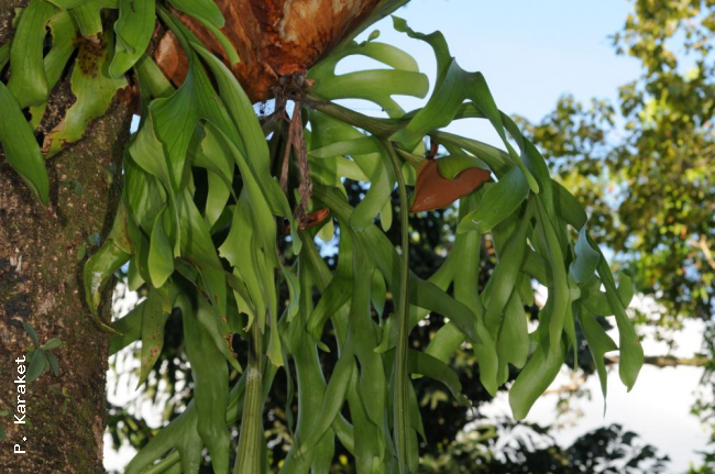 Platycerium coronarium (J.Koenig ex O.F.Müll.) Desv.FamilyPolypodiaceae NomenclaturePlatycerium coronarium (J.Koenig ex O.F.Müll.) Desv., Prodr.: 213. 1827; C.Chr., Bot. Tidsskr. 32: 349. 1916; Tardieu & C.Chr., Fl. Indo-Chine 7(2): 445. 1941; Holttum, Rev. Fl. Malaya ed. 1, 2: 138, f. 57. 1955 [‘1954’]; Tagawa & K.Iwats., SouthE. Asian Stud. 3(3): 75. 1965; Hennipman & Roos, Verh. Kon. Ned. Akad. 80: 92, f. 20e–h & 21. 1982; Tagawa & K.Iwats., Fl. Thailand 3: 489. 1989; Hennipman & Roos, Fl. Males., Ser. II, Ferns and Fern Allies 3: 138. 1998; Boonkerd & Pollawatn, Pterid. Thailand: 257, 283. 2000; Dy Phon, Dictionary of Plants used in Cambodia: 504. 2000; Newman et al., Checkl. Vasc. Pl. Lao PDR: 30. 2007; Leti et al., Fl. Photogr. Cambodge 559. 2013. – Osmunda coronaria J.Koenig ex O.F.Müll., Naturforscher (Halle) 21: 107, f. 3; 1785. – Type: Plate 3 in Müller, 1785 (the fertile frond only). Acrostichum biforme Sw., Schrad. J. Bot. 1800 (2): 11. 1801, pl. 11:2. – Platycerium biforme (Sw.) Blume, Fl. Javae Fil. 14, t. 18. 1829; Bedd., Handb. Ferns Brit. India: 445, f. 173. 1883; Christ, Bot. Tidsskr. 24: 105. 1901. DescriptionRhizome short creeping, more than 1 cm diam., fleshy, covered with scales at apex; scales broad, 15–35 by 4–10 mm, brown, herbaceous. Fronds strongly dimorphic with nest leaves and fertile fronds. Nest leaves 40–110 cm by 25–55, dichotomously lobed, the deepest sinus more than 20 cm deep, the lobes round at apex, about 5 cm in both length and width or longer; main veins raised on both surfaces, dichotomous, smaller veins copiously anastomosing, invisible; very thick, up to 1.5 cm thick and fleshy at base. Fertile fronds 50–125(–200) cm long, pendulous, several times dichotomously branching, lower branch unequal, bearing short sterile branches and a single, simple fertile lobe, upper branching almost equal; ultimate segments narrowly subtriangular, not pointed, entire, main veins dichotomous, raised, smaller veins hardly visible, forming copious network; fertile lobes stalked, almost circular to deeply cordate, up to 15 cm broad, the whole concave lower surface covered with a dense felt of stellate hairs and sporangia . Distribution in ThailandNORTH-EASTERN: Nong Khai; SOUTH-EASTERN: Chon Buri, Trat; PENINSULAR: Phuket, Krabi, Trang, Satun, Yala. Distribution in LaosUnspecified. Distribution in CambodiaUnspecified. Wider DistributionBurma (Tenasserim), Vietnam, Cambodia and N & W Malesia. EcologyEpiphytic on trunk of larger trees in open places at low altitudes, rather common. Proposed IUCN Conservation AssessmentLeast Concern (LC). This species is widespread and not under any known threat. Habit Pinna apex