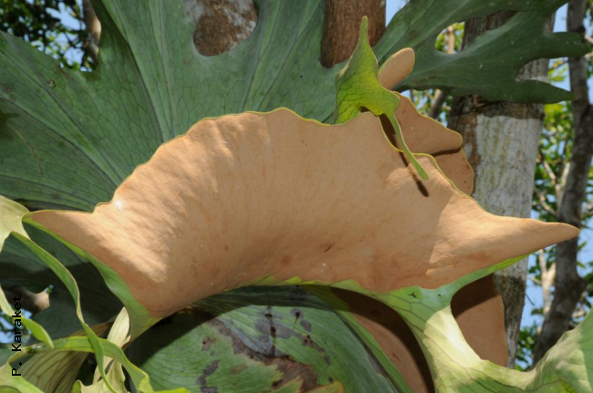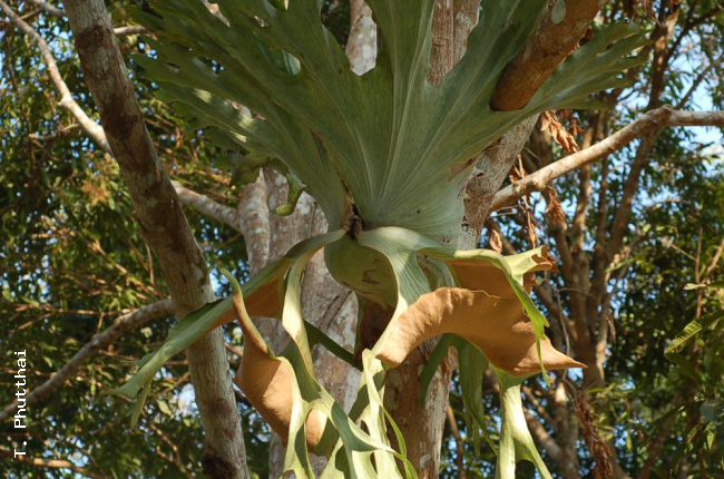 Platycerium holttumii de Jonch. & HennipmanFamilyPolypodiaceae NomenclaturePlatycerium holttumii de Jonch. & Hennipman, Brit. Fern Gaz. 10: 116, pl. 12, f.1–3. 1970; Hennipman & Roos, Verh. Kon. Ned. Akad. 80: 101, f. 25 & 26, pl. 2. 1982; Tagawa & K.Iwats., Fl. Thailand 3: 489. 1989; Hennipman & Roos, Fl. Males., Ser. II, Ferns and Fern Allies 3: 139. 1998; Boonkerd & Pollawatn, Pterid. Thailand: 257, 283. 2000; Newman et al., Checkl. Vasc. Pl. Lao PDR: 30. 2007. – Type: Hennipmann 3968 (L; iso BKF, KYO), Thailand. Platycerium grande auct. non J.Sm. ex Hook.: Bedd., Handb. Ferns Brit. India: 445, f. 271. 1883, p.p.; C.Chr., Contr. U.S. Natl. Herb. 26: 335. 1931; Tardieu & C.Chr., Fl. Indo-Chine 7(2): 446, f. 52.1. 1941; Newman et al., Checkl. Vasc. Pl. Lao PDR: 30. 2007. DescriptionRhizome scales basifixed, 15–28 by 1.5–4.5 mm, index 5–9, widest near the base, margin with hairs up to 1 mm long, apex acute to acuminate, midrib absent. Fronds strongly dimorphic with nest leaves and fertile fronds. Nest leaves base sessile, green, recurving when old, 90–115 by 90–135 cm, lower part with sinuous margin, upper part spreading, 3–6 x forked equally, basal fringe conspicuous. Foliage fronds maturing in symmetrical pairs, asymmetrical, 95–125 cm long, with 2 unequally long main lobes, each with a wide, horizontal soral patch and 2 lateral, pendulous lobes, those of the central main lobe forked 3–5 times, of the lateral main lobe forked 2–3 times. Hairs with 9–13 rays up to 0.3 mm long. Soral patch semicircular, 10–45 by 8–35 cm; sporangia with (16–)18–21 indurated annulus cells. Spores 64 per sporangium . Distribution in ThailandNORTHERN: Chiang Mai, Tak; NORTH-EASTERN: Loei, Nong Khai; EASTERN: Chaiyaphum, Nakhon Ratchasima; SOUTH-WESTERN: Kanchanaburi; SOUTH-EASTERN: Chanthaburi. Distribution in LaosLuang Phrabang, Xieng Khouang. Distribution in CambodiaUnspecified. Wider DistributionIndochina and Peninsular Malaysia. EcologyOn tree trunks in monsoon forests at low aititudes, rather rare. Proposed IUCN Conservation AssessmentLeast Concern (LC). This species is widespread and not under any known threat. Habit Nest leaves and fertile lobes Fertile lobes |
