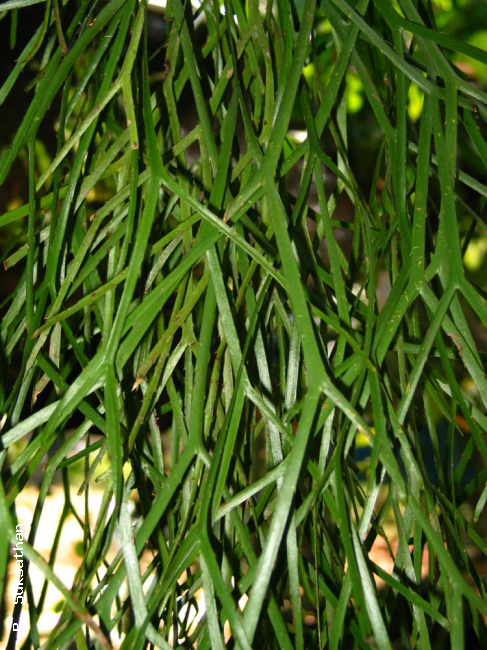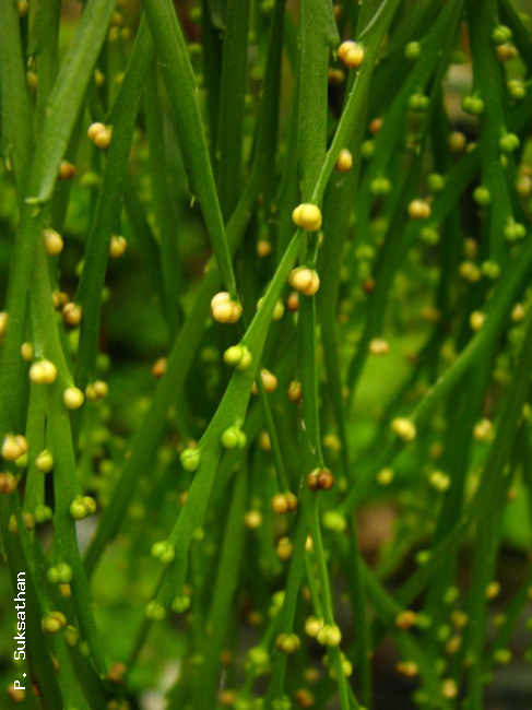 Psilotum complanatum Sw.FamilyPsilotaceae NomenclaturePsilotum complanatum Sw., Syn. Fil: 188, 414, t. 4, f. 5. 1806; Tagawa & K.Iwats., Acta Phytotax. Geobot. 25: 16. 1971; Tagawa & K.Iwats., Fl. Thailand 3: 6, f. 1.7–1.8. 1979; Boonkerd & Pollawatn, Pterid. Thailand: 63. 2000; Kiew, Fl. Pen. Malaysia, Ser. I, Ferns & Lycoph. 1: 88. 2010. – Type: Herb. Willdenow s.n., America (holotype B). DescriptionDescription from Kiew, Fl. Pen. Malaysia, Ser. I, Ferns & Lycoph. 1: 88. 2010.Pendent epiphyte. Rhizomes creeping, 0.5–1.5 mm diameter. Aerial stems and branches flattened with a distinct midrib, usually 20–100 cm long, exceptionally to 2 m long, lower unbranched part (9–)22–25(–36) cm long and (2–)3–4 mm wide, upper branches (13–)35(60) cm long, 2–3(–4) min wide, synangia inset laterally giving the stem a jagged appearance, appendages lateral and alternate, 1–2 mm long. Synangia 1(–3) mm diameter, yellowish green becoming yellow when mature . Distribution in ThailandPENINSULAR: Surat Thani. Wider DistributionPantropical. EcologyEpiphytic on tree trunks in light shade. Proposed IUCN Conservation AssessmentLeast Concern (LC). This species is widespread and not under any known threat. It has been given an assessment of near Threatened in the Flora of Peninsular Malaysia. Habit Sporangia |
