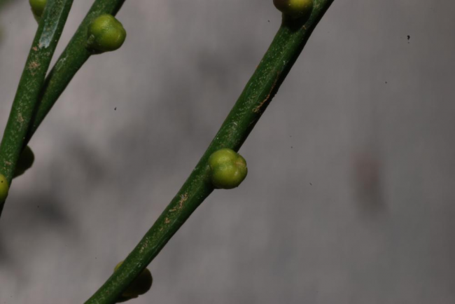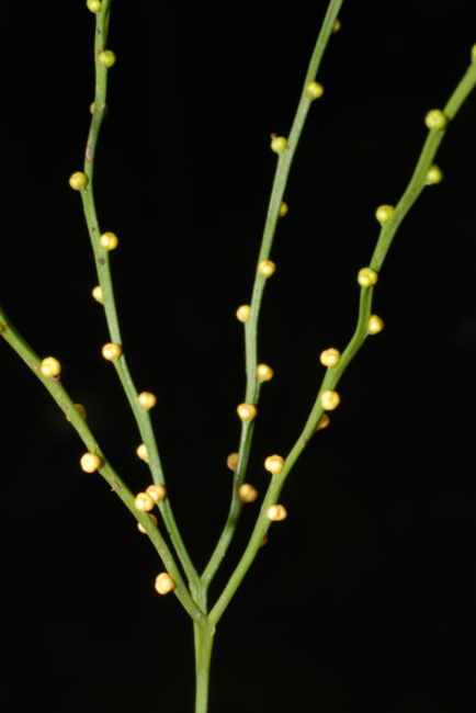 Psilotum nudum (L.) P.Beauv.FamilyPsilotaceae NomenclaturePsilotum nudum (L.) P.Beauv., Prod. Aethéog.: 112. 1805; Tagawa & K.Iwats., SouthE. Asian Stud. 5: 26. 1976; Tagawa & K.Iwats., Fl. Thailand 3: 5. 1979; Kiew, Fl. Pen. Malaysia, Ser. I, Ferns & Lycoph. 1: 90. 2010. – Lycopodium nudum L., Sp. Pl.: 1100. 1753. – Type: India, LINN No. 1257.1 (lectotype LINN). Psilotum triquetrum Sw., Syn. Fil.: 117. 1806; Hosseus, Beih. Bot. Centralbl. 28(2): 367. 1911; Bonap., Not. Ptérid. 14: 70. 1923; Tardieu & C.Chr., Fl. Indo-Chine 7(2): 596, f. 64.4 & 64.5. 1951; Larsen, Dansk Bot. Ark. 23: 59. 1963. DescriptionRhizome creeping, dichotomously branching at irregular intervals, 0.5-1.5 mm in diameter, densely beset with brown to dark brown rhizoids. Aerial stems fasciculate, erect, patent, or pendulous, 10–60 cm in height, green, glabrous, dichotomously branching several times in upper portion, grooved, with several distinct ridges 0.5–1.5 mm in diameter. Scaly projections small, to 1 mm long, oval with subulate apex, irregularly and sparsely borne on ridges. Synangia borne adaxially to the projections, glabrous, about 2 mm in diameter, green at first, yellow when mature , with lemon-yellow or paler spores. Distribution in ThailandNORTHERN: Chiang Mai, Chiang Rai, Tak; NORTH-EASTERN: Loei, Khon Kaen; SOUTH-WESTERN: Kanchanaburi, Prachuap Khiri Khan; CENTRAL: Nakhon Nayok; SOUTH-EASTERN: Chon Buri, Chanthaburi; PENINSULAR: Chumphon, Ranong, Surat Thani, Nakhon Si Thammarat, Phatthalung. Distribution in LaosHua Phan, Khammoune, Xieng Khouang. Wider DistributionTropics and subtropics throughout the world (type from India), north to Jeju Island (South Korea). EcologyUsually epiphytic on mossy tree-trunks in dense forest or in light shade at low to medium altitudes. Proposed IUCN Conservation AssessmentLeast Concern (LC). This species is widespread and not under any known threat. Voucher specimens - ThailandPooma et al. 6698, Ranong (A, BKF, E); Middleton et al. 5401, Phatthalung, Khao Kram Waterfall (E). Voucher specimens - LaosPoilane 1908, Hua PHan, Muong Pun (P); Delacour s.n., Khammouane (P); Poilane 2422, Xieng Kouang (P). Habit Whole plant Young sporangium Mature sporangia |