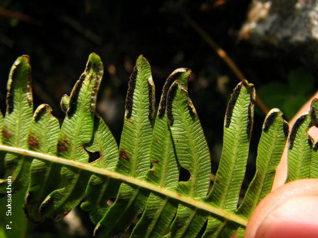 Pteris subquinata Wall. ex J.AgardhFamilyPteridaceae, subfamily Pteridoideae NomenclaturePteris subquinata Wall. ex J.Agardh, Recens. Spec. Pter.: 21. 1839; Tagawa & K.Iwats., SouthE. Asian Stud. 5: 80: 1967; Tagawa & K.Iwats., Fl. Thailand 3: 239, f. 18.3. 1985; Boonkerd & Pollawatn, Pterid. Thailand: 131. 2000; Newman et al., Checkl. Vasc. Pl. Lao PDR: 31. 2007. – Pteris quadriaurita var. subquinata (Wall. ex J.Agardh) Bedd., Suppl. Ferns Brit. India: 23. 1892. Pteris linearis var. fauriei (Hieron.) C.Chr. & Tardieu, Not. Syst. 6: 140. 1938, p.p., excl. type; Tardieu & C.Chr., Fl. Indo-Chine 7(2): 159. 1940, p.p. DescriptionRhizome short, creeping or ascending, bearing a few close fronds, densely scaly at apex; scales linear, up to 7 by 0.7 mm, dark brown, entire, toothed at basal portion, firm. Stipes dark brown, scaly at base, stramineous and glabrescent upwards, 20–40 cm long, to 52 cm on fertile frond. Laminae ovate in outline, deeply bipinnatisect to bipinnate, up to 30 cm long and wide; rachis glabrescent, grooved on upper surface; lateral pinnae 1–4 pairs, opposite, oblong-lanceolate, more or less falcate, up to 20 by 6 cm, basal one or two pinnae bearing basal basiscopic pinnules just like upper lateral pinnae in size and form, terminal pinnae a little larger; pinnules linear-lanceolate, falcate, up to 30 by 7 mm in sterile and 5 mm in fertile ones, the base free or decurrent to the next ones with wings of costa less than 0.5 mm wide, firm, green; costa and costules glabrous beneath, veins once or twice forked, distinct on both surfaces. Sori continuous along margin of pinnules; indusia firm , light brown. Distribution in ThailandNORTHERN: Chiang Mai. Distribution in LaosUnspecified. Wider DistributionHimalaya to Laos. EcologyOn rather dry slopes at foot of limestone cliffs in light shade at 1300–1600 m alt. Proposed IUCN Conservation AssessmentLeast Concern (LC). This species is widespread outside of Thailand and not under any known threat. NotesMorton, in his Studies of Fern Types, makes a case for why a lectotype should be chosen from the two Wallich Cat. 104 specimens in the Hooker Herbarium and in the Herbarium of the East India Company but he did not go so far as to do this himself. Voucher specimens - ThailandMiddleton et al. 4988, Chiang Mai, Doi Chiang Dao Wildlife Sanctuary (E). Habit Habit Habit Rhizome Rhizome Upper surface of lamina Pinnules and sori Sori Old sori |