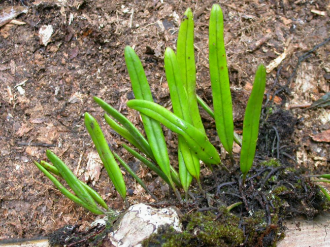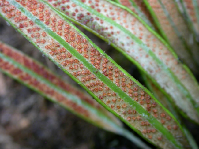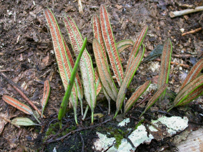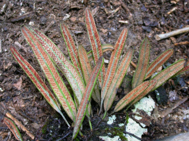 Pyrrosia rasamalae (Racib.) K.H.ShingFamilyPolypodiaceae NomenclaturePyrrosia rasamalae (Racib.) K.H.Shing, Amer. Fern J. 73: 78. 1983; Hovenkamp, Fl. Males., Ser. II, Ferns and Fern Allies 3: 171. 1998; Boonkerd et al., Thai For. Bull. (Bot.) 32: 10. 2004. – Polypodium rasamalae Racib., Pteridoph. Buitenzorg: 99. 1898. – Type: Raciborski 83 (BO, K, L, M, P, US), Java. DescriptionDescription from Hovenkamp, Fl. Males., Ser. II, Ferns and Fern Allies 3: 171. 1998.Rhizome 1–3 mm thick, long creeping, phyllopodia 1–5 cm apart, buds in the lower half of the internodes. Anatomy: vascular strands 4–8, sclerenchyma sheath distinct, sclerenchyma strands up to 10, scattered. Rhizome scales spreading, peltate, 4–9.5 by 0.4–1.4 mm, base entire, acumen ciliate, shining light brown or hyaline, rounded to ovate scales without acumen regularly present. Fronds simple, monomorphic, stalked, stipe 1–10 cm long, to 0.25(–0.5) x as long as the lamina, lamina 3.5–36 by 0.3–1.4 cm, base narrowed, widest at or below the middle, apex obtuse to acute. Venation: veins distinct, veinlets simple, free, excurrent. Hydathodes absent. Stellate hairs dimorphic, forming a dense mat, light brown, the straight rays boat-shaped to acicular, separate from the lower layer. Sori apical or all over the lamina, closely packed, 2 or 3 in a row in each creole, superficial, developing acropetally. Sporangia stalked, paraphyses not differentiated. Spores with irregular ridges and protuberances. Distribution in ThailandNORTHERN: Tak; SOUTH-WESTERN: Phetchaburi. Wider DistributionMalesia. EcologyEpiphytic in primary evergreen forest. In bamboo thicket. Proposed IUCN Conservation AssessmentLeast Concern (LC). This species is widespread outside of Thailand and not under any known threat. Voucher specimens - ThailandMiddleton et al. 1803, Phetchaburi, Kaeng Krachan (A, BKF). Whole plant Upper surfaces of fronds Lower surfaces of fronds Sori |