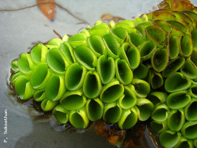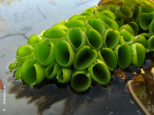 Salvinia cucullata Roxb. ex BoryFamilySalviniaceae NomenclatureSalvinia cucullata Roxb. ex Bory in Bél., Voy. Indes Or. 2: 6. 1833; Tardieu & C.Chr., Fl. Indo-Chine 7(2): 543. 1941; Holttum, Rev. Fl. Malaya ed. 1, 2: 621. 1955 [‘1954’]; Holttum, Dansk Bot. Ark. 20: 35. 1961; Tagawa & K.Iwats., SouthE. Asian Stud. 3(3): 89. 1965; Tagawa & K.Iwats., SouthE. Asian Stud. 5: 112. 1967; Tagawa & K.Iwats., Fl. Thailand 3: 604. 1989; Boonkerd & Pollawatn, Pterid. Thailand: 97, 116. 2000; Newman et al., Checkl. Vasc. Pl. Lao PDR: 32. 2007. Salvinia natans auct. non (L.) All.: Dy Phon, Dictionary of Plants used in Cambodia: 546. 2000. DescriptionFloating leaves thick but soft, 1.2–1.8 cm long, wider than long, with sides curved upwardly and inwardly to meet the edges; upper surface covered with dense short projections bearing setae; lower surface with a few downy hairs. Sori many on various branches of the submerged leaves. Distribution in ThailandNORTHERN: Chiang Mai; SOUTH-WESTERN: Prachuap Khiri Khan; CENTRAL: Phra Nakhon Si Ayutthaya, Pathum Thani; PENINSULAR: Surat Thani. Distribution in LaosChampasak. Distribution in CambodiaKampot. Wider DistributionIndia, Indochina, Peninsular Malaysia to Sumatra. EcologyFloating on water in open places. Proposed IUCN Conservation AssessmentLeast Concern (LC). This species is widespread and not under any known threat. NotesIn Cambodia said to be used to feed pigs (Dy Phon, 2000). Habit Habit Habit |