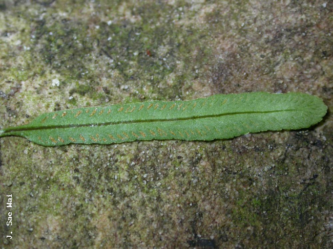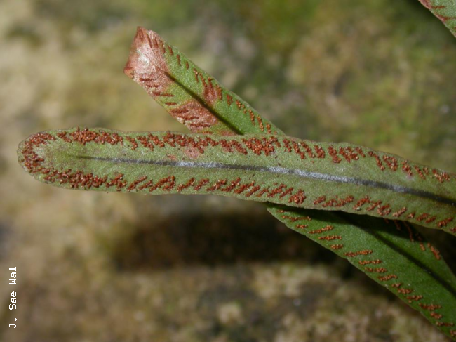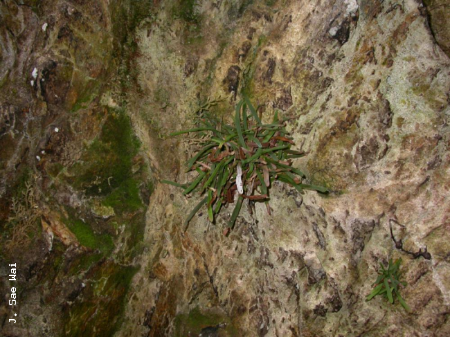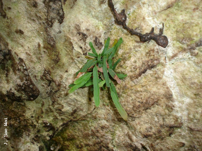 Syngramma minima HolttumFamilyPteridaceae, subfamily Pteridoideae NomenclatureSyngramma minima Holttum, Gard. Bull. Straits Settlem. 4: 56. 1927; Holttum, Rev. Fl. Malaya 2: 585, fig. 345. 1955 ['1954']; Wai et al., Thai For. Bull. (Bot.) 39: 28. 2012 ['2011']. – Type: Peninsular Malaysia, Gunong Panti, 14 Feb. 1926, Holttum [SFN] 17498 (Lectotype : BM (Barcode: BM000066405); isolectotypes: BM (Barcode: BM000066788), K, SING, US). DescriptionLithophyte (but also recorded, possibly mistakenly, as terrestrial). Rhizome short, creeping, 1.5-3 mm diam. when fresh, 1-1.5 mm diam. when dry, bearing crowded fronds, densely covered with bristles; bristles stiff, multicellular, 0.5-1.5 mm long, dark brown but slightly translucent and very shiny. Fronds monomorphic, simple. Stipes not articulate to rhizome, 1-3 cm long, narrowly and shallowly grooved above, very narrowly winged, green or sometimes purplish brown, densely covered with bristles (like those on the rhizome) at the base. Laminae coriaceous, rigid, narrowly oblong to linear-oblong or spatulate, 2-11 by 0.35-1 cm, olive green, glabrous, apex rounded, base attenuate, margin cartilaginous, lateral margins varying from almost entire to strongly denticulate, apical margin always crenate or denticulate; midrib slightly raised above, strongly raised below, narrowly and shallowly grooved above when fresh but grooves indistinct when dry, green or sometimes purplish brown; veins simple or once forked, all (except sometimes the most basal ones) joining an intramarginal vein, slightly raised on the upper surface, sometimes inconspicuous especially in old fronds. Fertile fronds soriferous for their entire length. Sori exindusiate, linear along the veins, extending from about half way to near the apical part of veins, 0.5-2 mm long; soral paraphyses present and conspicuous, terminal cells enlarged, reddish brown or red, translucent and shiny; sporangia subsessile (but at lower magnifications appearing sessile), 0.15- 0.2 mm diam., glabrous; annulus vertical, interrupted by the sporangial stalk. Spores trilete, tetrahedral, subglobular, 35-40 µm diam., rough, irregularly tuberculate , pale yellow. Distribution in ThailandPENINSULAR: Yala, Narathiwat. Wider DistributionPeninsular Malaysia. EcologyWai 984 was collected on cliffs in shady areas near the top of quartzitic phyllite ridges at an altitude of 650 m. Niyomdham 4845 is reported to have been terrestrial at 665 m but with no other habitat information. The type material (Holttum [SFN] 17498) was found growing among liverworts on a vertical rock face at approximately 488 m ("1600 ft") but the precise nature of this rock is uncertain, having been described first as "sandstone" (Holttum, 1927) then later as "quartzite" (Holttum, 1955). Proposed IUCN Conservation AssessmentData Deficient (DD). The species is known from very few collections which are quite widely separated and its precise distribution is unclear. The few collections suggest it is rarely encountered but the lack of good distribution data leaves us to conclude it must be given a DD status. NotesUntil its discovery in Thailand Syngramma minima Holttum was known only from the type locality in Peninsular Malaysia. Voucher specimens - ThailandWai 984, Yala, Betong (PSU); Niyomdham 4845, Narathiwat (BKF). Habit Habit Rhizome Upper surface of lamina Lower surface of lamina with sori |