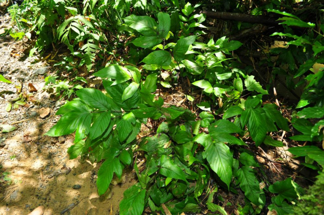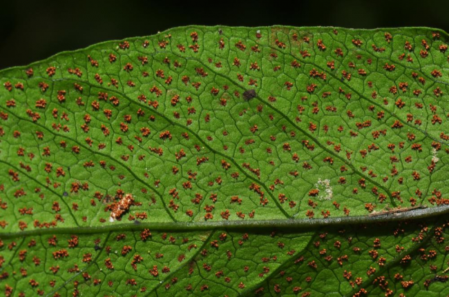 Tectaria angulata (Willd.) C.Chr.FamilyTectariaceae NomenclatureTectaria angulata (Willd) C.Chr, Index Fil. Suppl. 3: 177. 1934, Holttum, Rev. Fl. Malaya ed. 1, 2: 511, f. 301. 1955 [‘1954’]; Tagawa & K.Iwats., SouthE. Asian Stud. 3(3): 86. 1965; Tagawa & K.Iwats., Acta Phytotax. Geobot. 23: 55. 1968; Tagawa & K.Iwats., Fl. Thailand 3: 373, f. 34.3. 1988; Holttum, Fl. Males., Ser. II, Pterid. 2: 85. 1991; Boonkerd & Pollawatn, Pterid. Thailand: 211. 2000. – Polypodium angulatum Willd., Sp. Pl. 5: 185. 1810. – Aspidium angulatum (Willd.) J.Sm. ex Mett., Ann. Mus. Bot. Lugduno-Batavi 1: 239. 1864; Bedd., Suppl. Ferns Brit. Ind.: 45. 1892. – Type: Ventenat s.n., Java (B, herb Willd. 19641). DescriptionRhizome short, creeping or ascending; scales linear-subtriangular, up to 20 by 1.8 mm, stiff, dark brown, entire. Stipes castaneous, or nearly black, more or less polished, densely scaly at lower part, glabrescent upwards, up to 50 cm long. Laminae pinnate, oblong-ovate to oblong, up to 50 by 40 cm, rachis pubescent on upper surface, glabrous beneath, castaneous, lateral pinnae 2–6 pairs, ascending, oblong, caudate at apex, rounded at base, entire, shortly stalked or sessile, up to 20 by 9 cm; basal pinnae bearing a single basiscopic lobe; terminal pinna larger, oblong-subdeltoid, caudately acuminate at apex, up to 23 by 12 cm, softly papyraceous, green, brown in dried condition, glabrous on both laminar surfaces, costa castaneous to paler, pubescent on upper surface, hirsute or glabrescent beneath, main veins raised beneath, glabrous; veins distinct on lower surface, reticulate to form fine anastomosis with main areoles and smaller ones, included free veinlets numerous, glabrous; bulbils present on upper surface at base of terminal pinna and sometimes on coastae of upper surface of other pinnae. Sori on included free veins, round, small, up to 1 mm diam., irregularly scattered on lower surface, indusia small, caducous . Distribution in ThailandNORTHERN: Lampang; SOUTH-WESTERN: Prachuap Khiri Khan; PENINSULAR: Phangnga, Phuket, Trang, Satun, Yala. Wider DistributionMalesia. EcologyOn rather dry ground in evergreen forests at low altitudes. Proposed IUCN Conservation AssessmentLeast Concern (LC). This species is widespread and not under any known threat. Voucher specimens - ThailandMiddleton et al. 5444, Phangnga, Sra Nang Manora Forest Park (E). Habit Habit Rhizome and crozier Lamina Bulbil Bulbil Venation Lower surface of lamina with sori Lower surface of lamina with sori Sori |