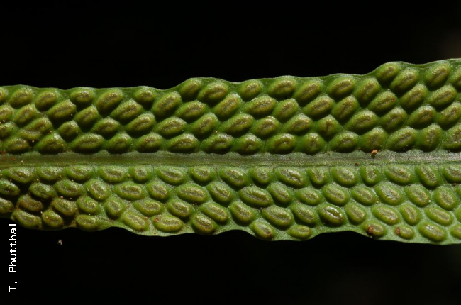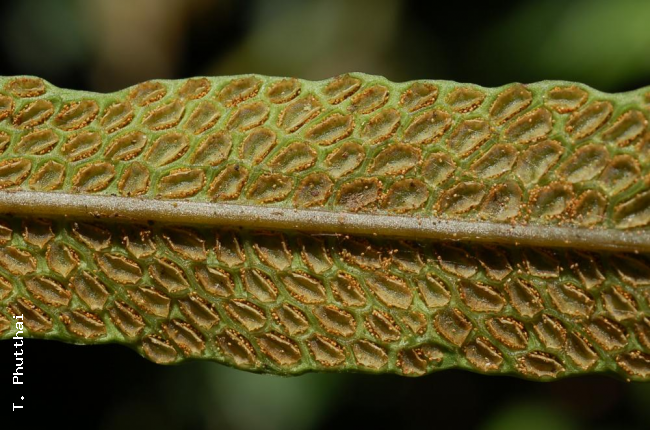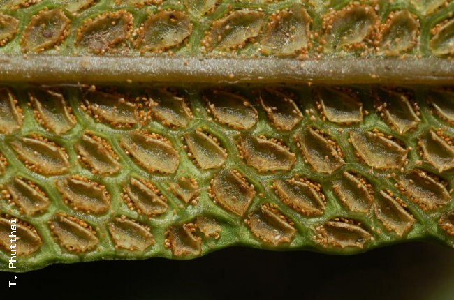Tectaria shahidaniana RuseaFamilyTectariaceae NomenclatureTectaria shahidaniana Rusea, Folia Malaysiana 5: 28. 2004. DescriptionFrom protologue :Rhizome erect. Scales at base of stipe 3 mm long, shining brown with paler margin. Fronds dimorphic, lamina simple, glabrous on both surfaces except few short hairs on midrib or main veins beneath. Sterile fronds: stipes to 20 cm long, with short white hairs; lamina 25–40 x 5–7 cm, margin entire, venation reticulate forming many areoles and areolules with free included veins. Fertile fronds: stipes to 30 cm long, with short white hairs; lamina 25–30 x 1.5–3 cm, margin undulate, veins forming two rows of areoles with free included veinlets; sori large, one to each areole, terminal on included veinlets, indusia peltate, persistent . Distribution in ThailandPENINSULAR: Nakhon Si Thammarat. Wider DistributionPeninsular Malaysia. EcologyDry evergreen forest on granite bedrock at about 300 m alt. Proposed IUCN Conservation AssessmentLeast Concern (LC). Although this species is restricted in its distribution in Malaysia and Thailand it is reasonably common in the protected area of Khao Luang National Park and not under any known threat. Voucher specimens - ThailandMiddleton et al. 5538, Nakhon Si Thammarat, Khao Luang National Park (E). Habit Venation in sterile frond Upper surface of fertile frond Lower surface of fertile frond Sori |